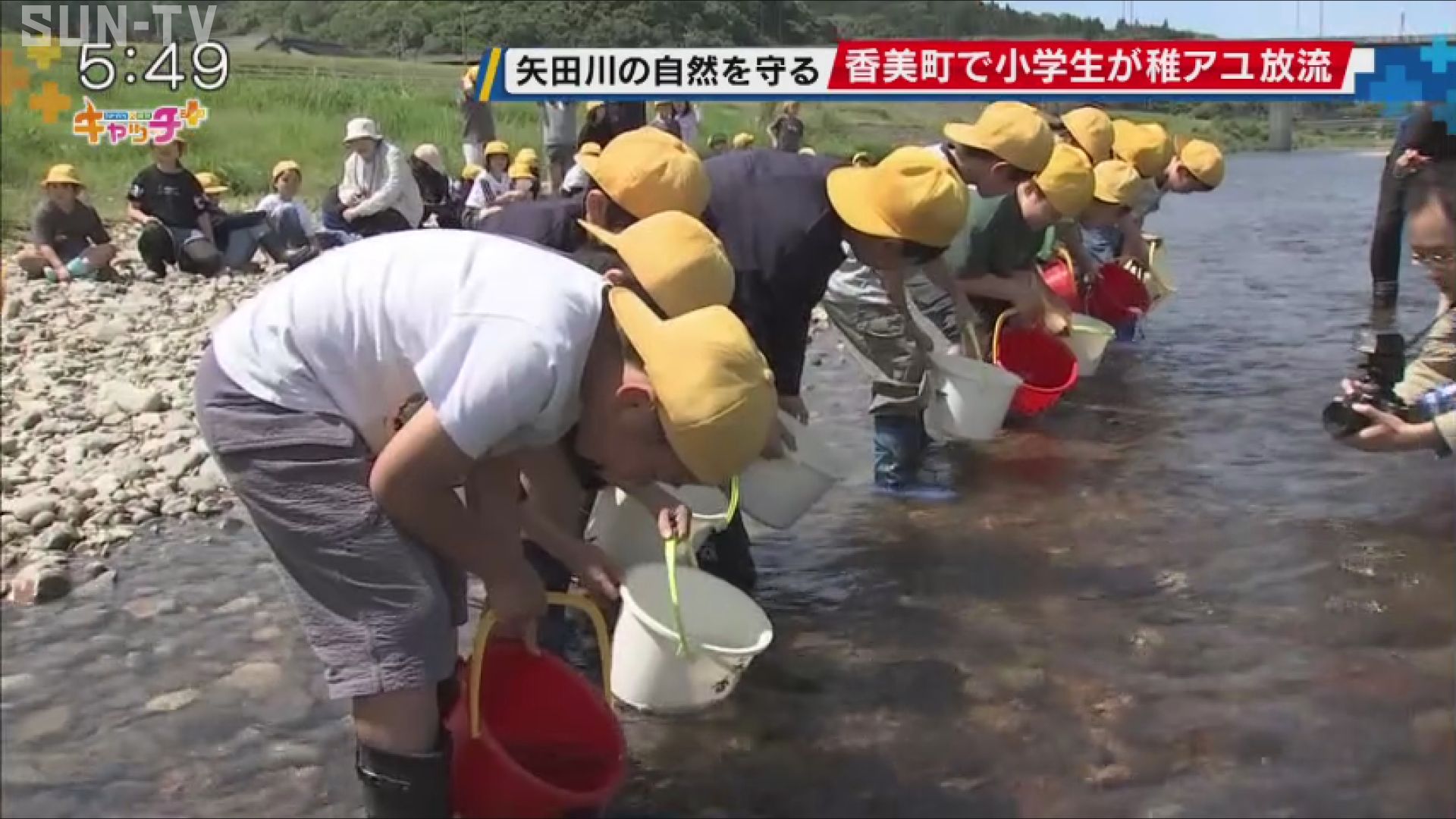 6月のアユ漁解禁を前に、兵庫県香美町の矢田川で、地元の小学生がアユの稚魚を放流しました。