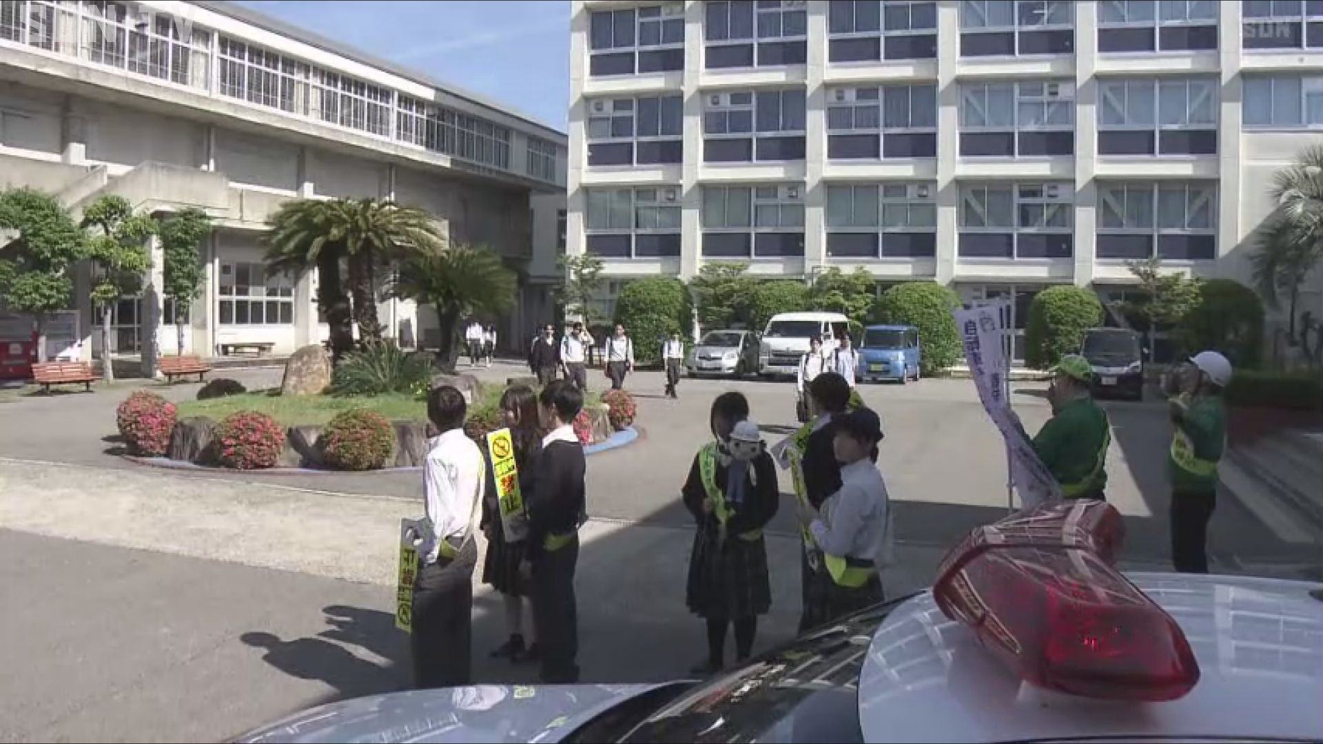 生徒たちはパトカーの拡声器を使い登校中の生徒に対しヘルメット着用の徹底などを呼び掛けました。
