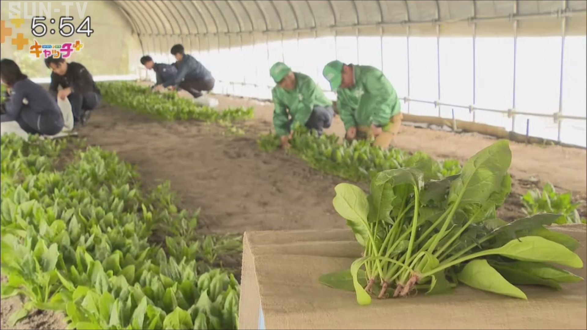 5月28日には、ホウレンソウ350キロの出荷式が開かれ、出席者はおいしい野菜の生育を祝うとともに収穫を体験しました。