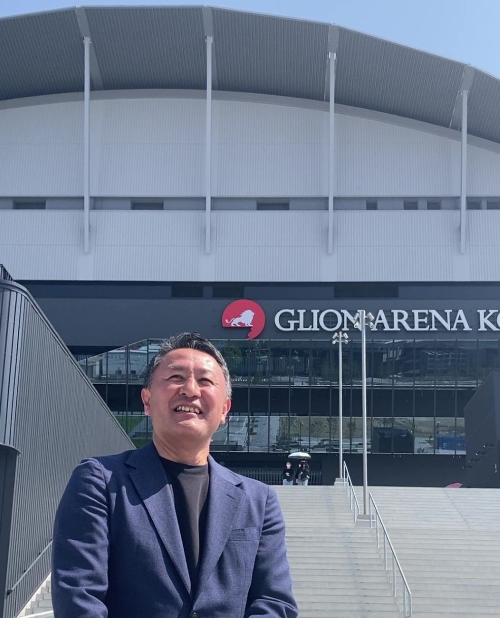 ジーライオンアリーナ神戸をバックに 株式会社ストークス 渋谷 順 社長