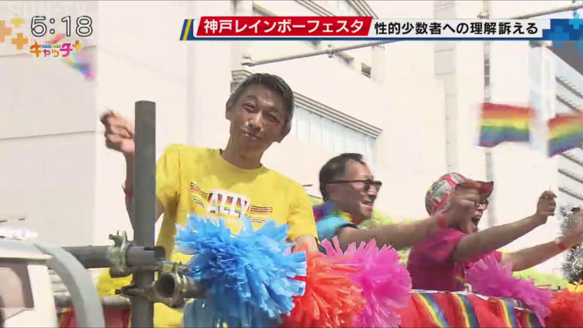 多様性の象徴とされる虹色の旗を掲げ、フラワーロードを中心に神戸・三宮周辺を行進しました。