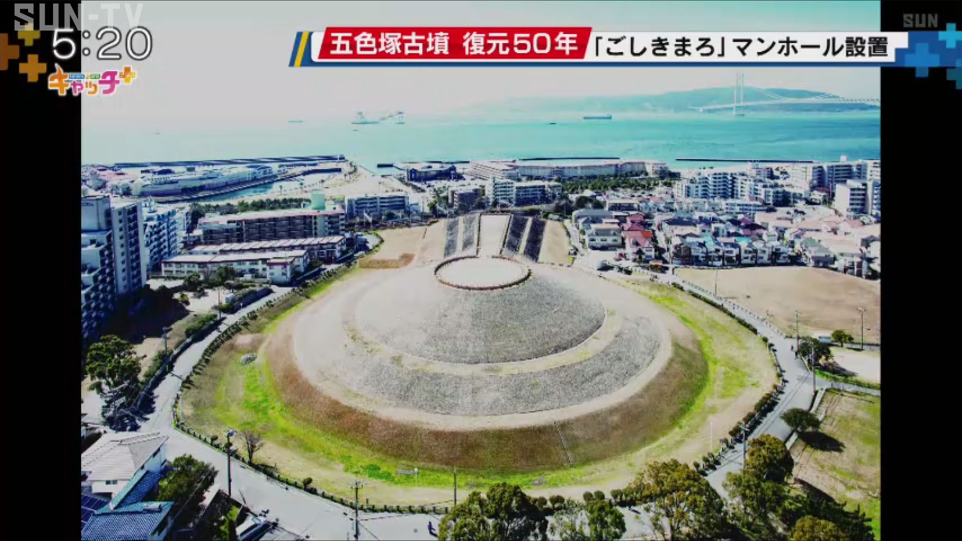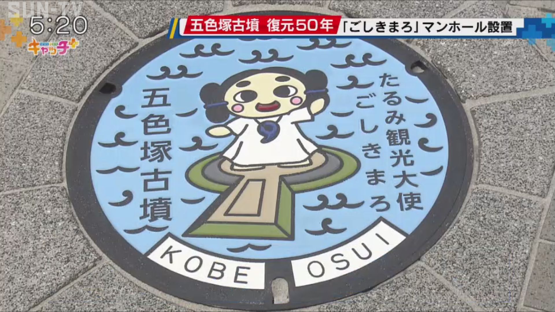 このマンホールは「五色塚古墳」が、築造当時の姿に復元整備されてからことし8月で50年となるのを記念して設置されました。