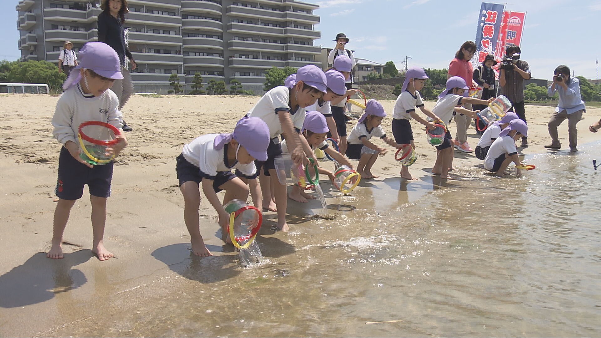 海の豊かさや大切さを感じてもらおうと、明石市の海岸で、地元の園児たちがヒラメの稚魚を放流しました。