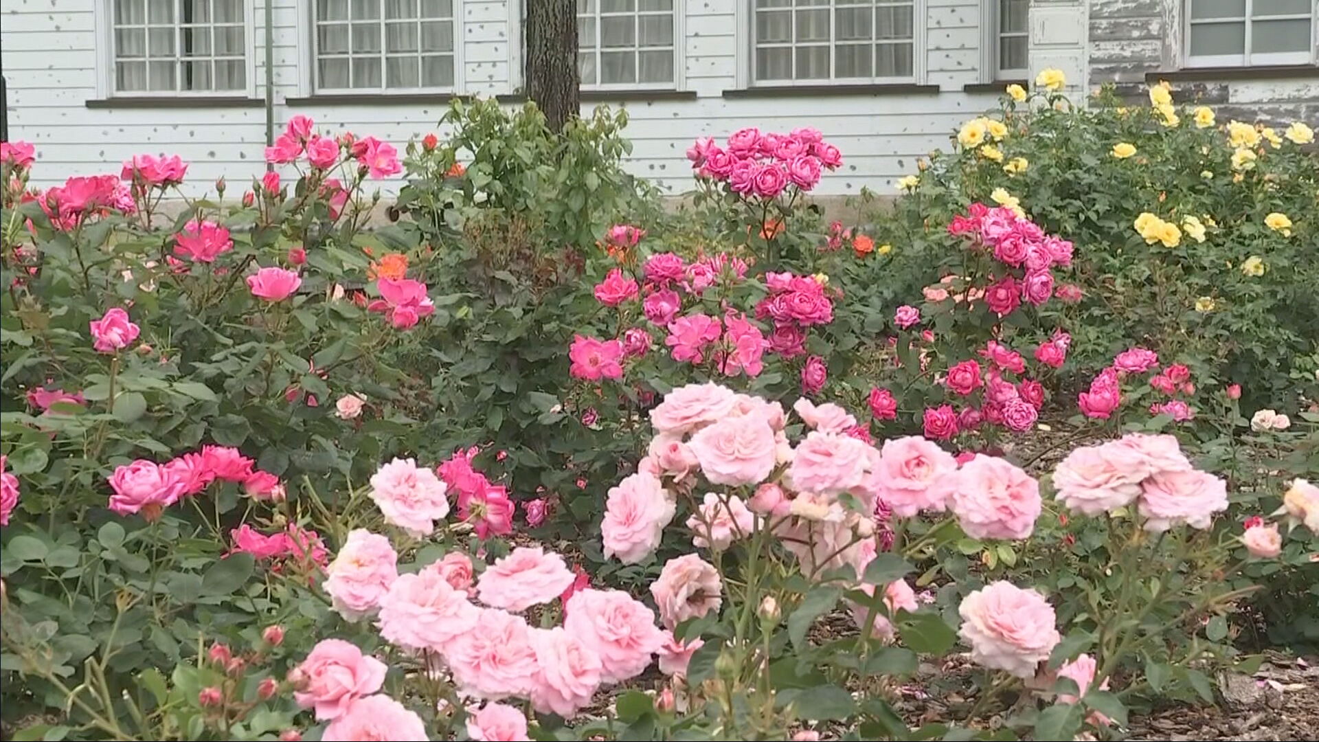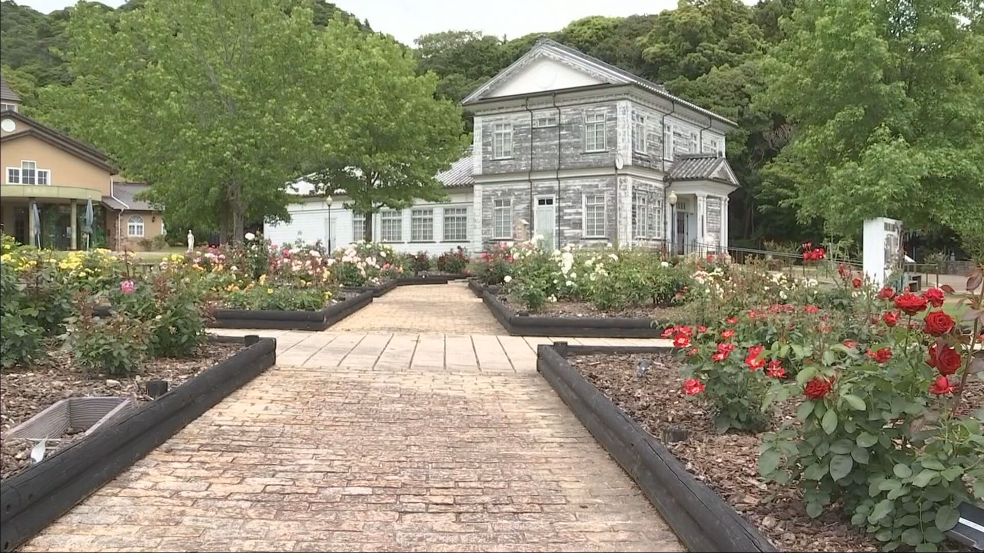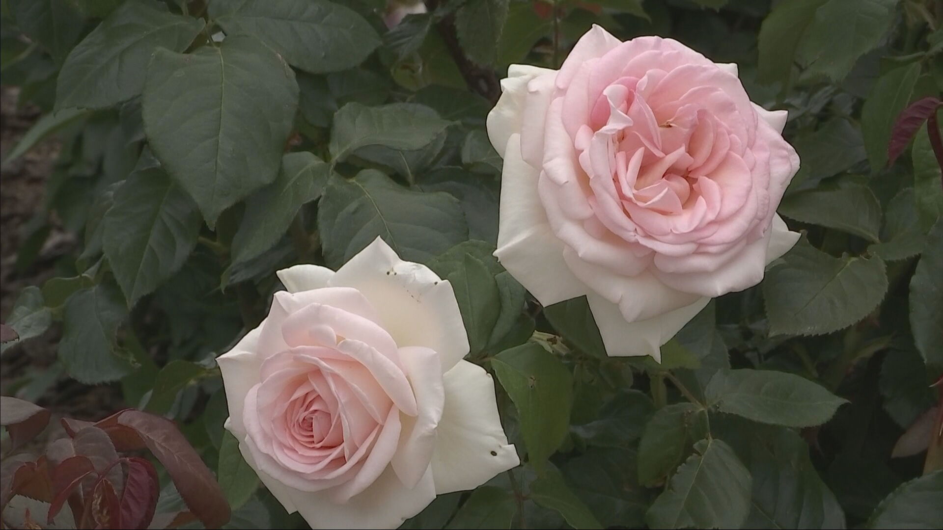 南あわじ市の「淡路ファームパークイングランドの丘」では、約1500平方メートルの敷地に植えられた110品種680株のバラが見頃を迎えています。