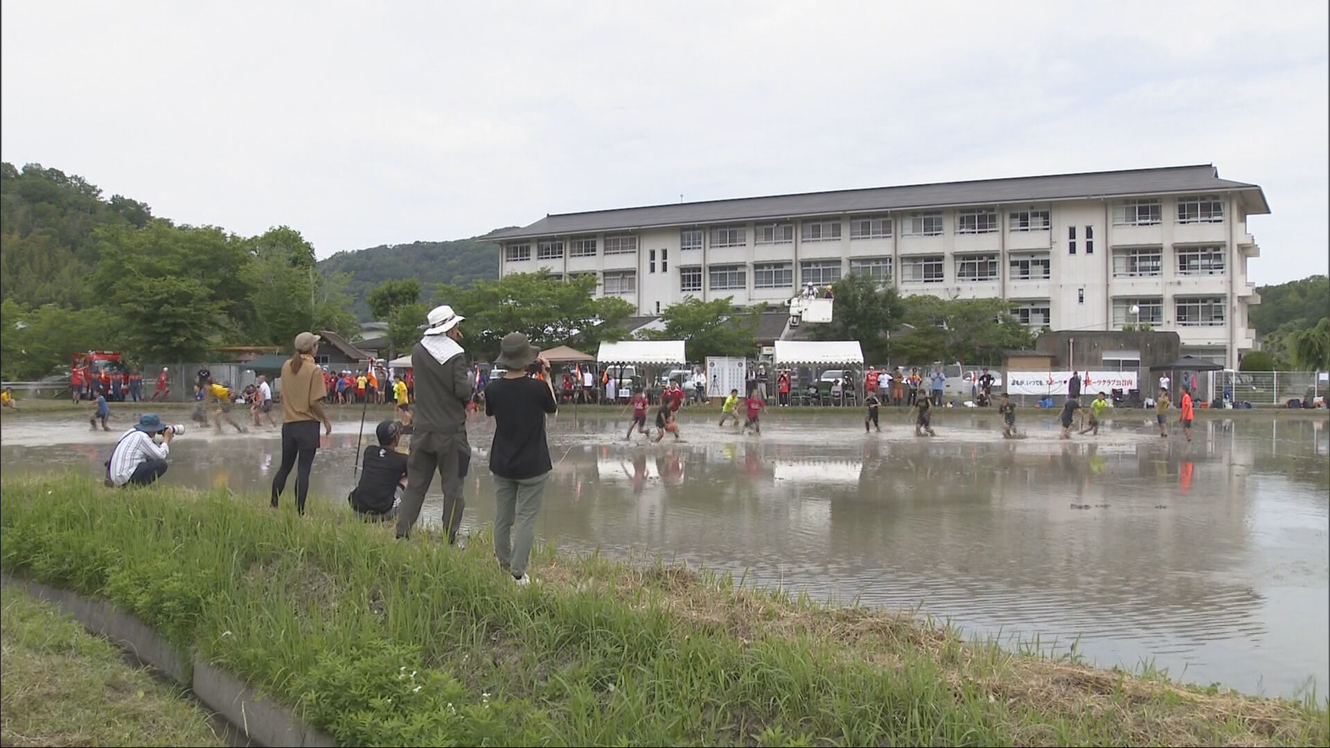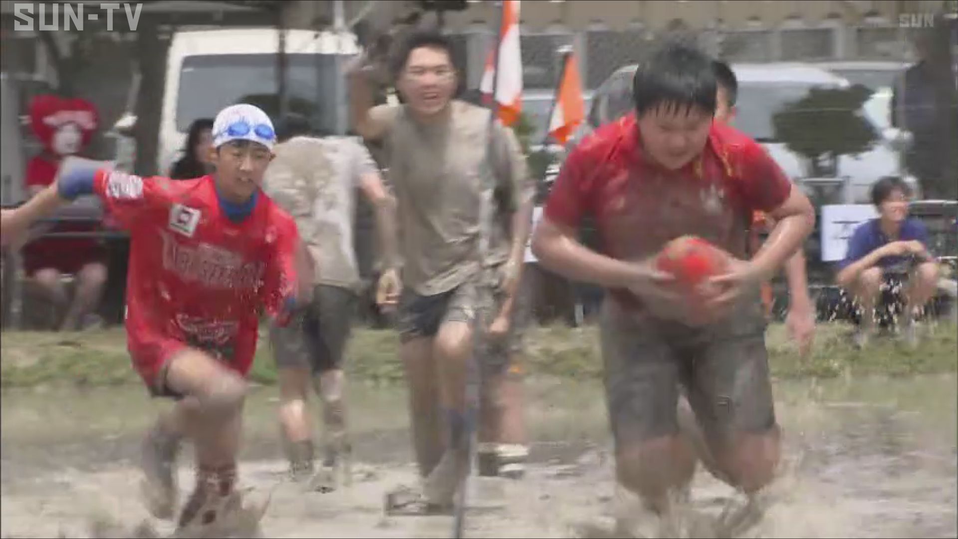 兵庫県姫路市では、田んぼをフィールドに見立てた「たんぼラグビー」の大会が6月7日行われ、参加者は泥まみれになりながら、トライを目指しました。