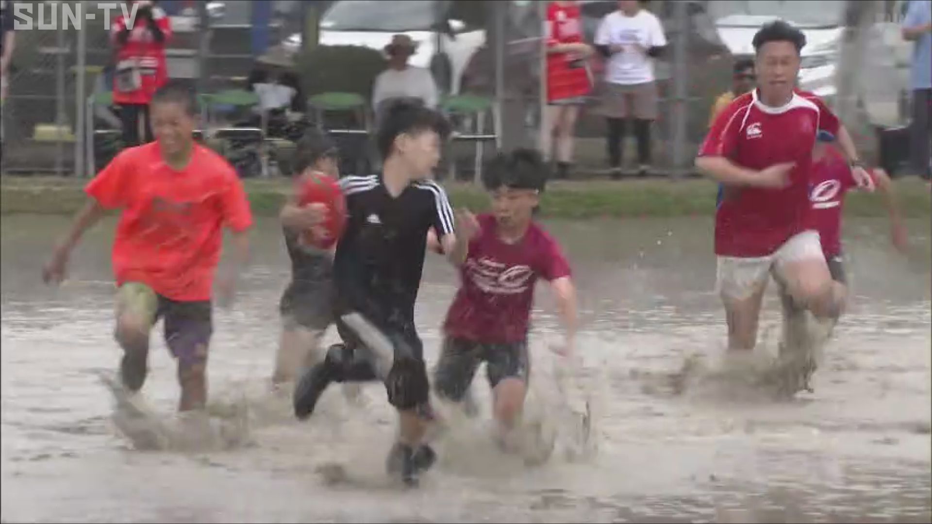 選手は泥のぬかるみに足をとられながらも、パスをつなぎ、しぶきを上げながら、果敢にトライを決めていました。