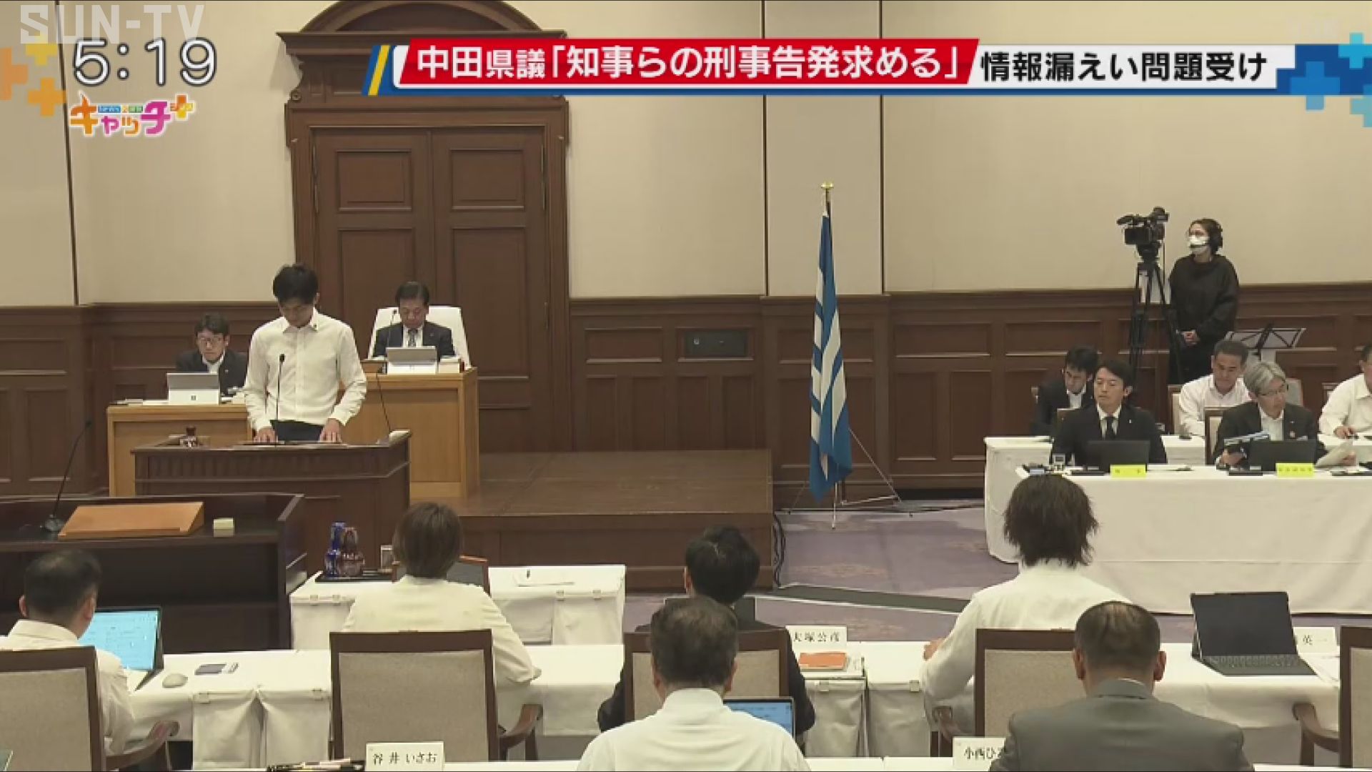 兵庫県議会の一般質問が9日に行われ、ひょうご県民連合の中田議員は、元西播磨県民局長の私的な情報が漏えいした問題について、斎藤知事や元副知事を刑事告発するよう県に求めました。