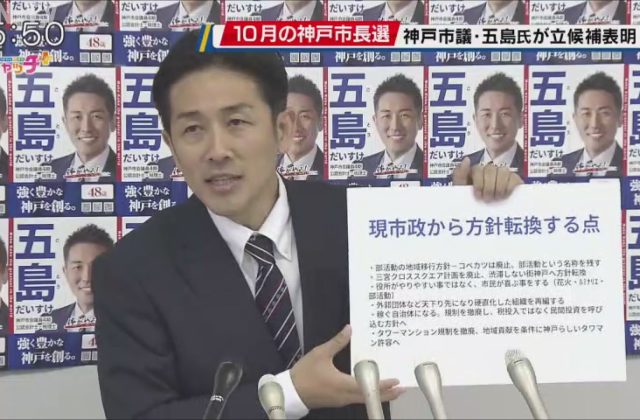 また、神戸市議の五島大亮さんが11日、自民党を離党し、今週末にも無所属で立候補する意向を示す見込みです。