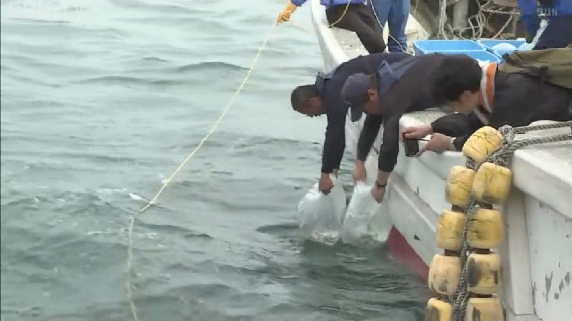淡路市の育波浦漁港の沖で海に放流されたのは、1ヶ月ほど飼育されたイカナゴ約1500匹です。
