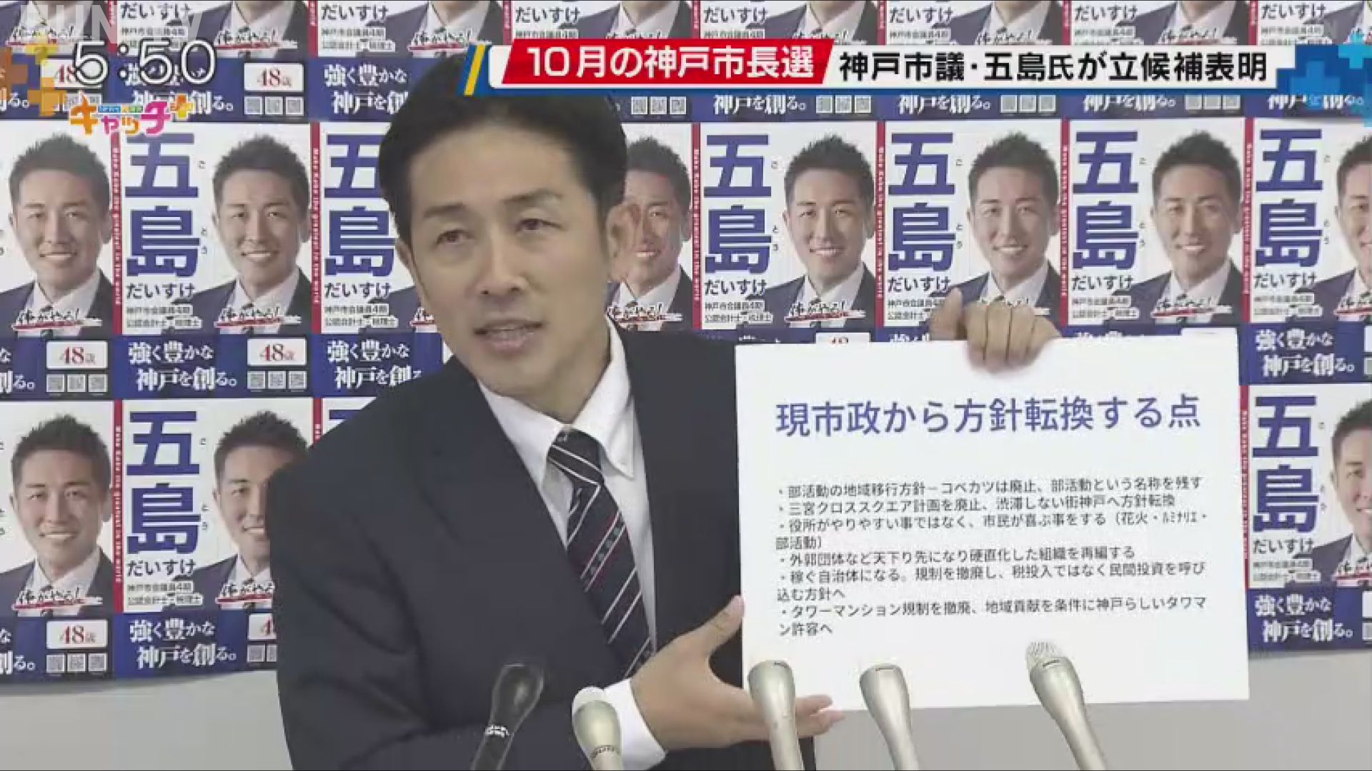 任期満了に伴いことし10月に投開票される神戸市長選に、神戸市議の五島大亮さんが立候補を表明しました。