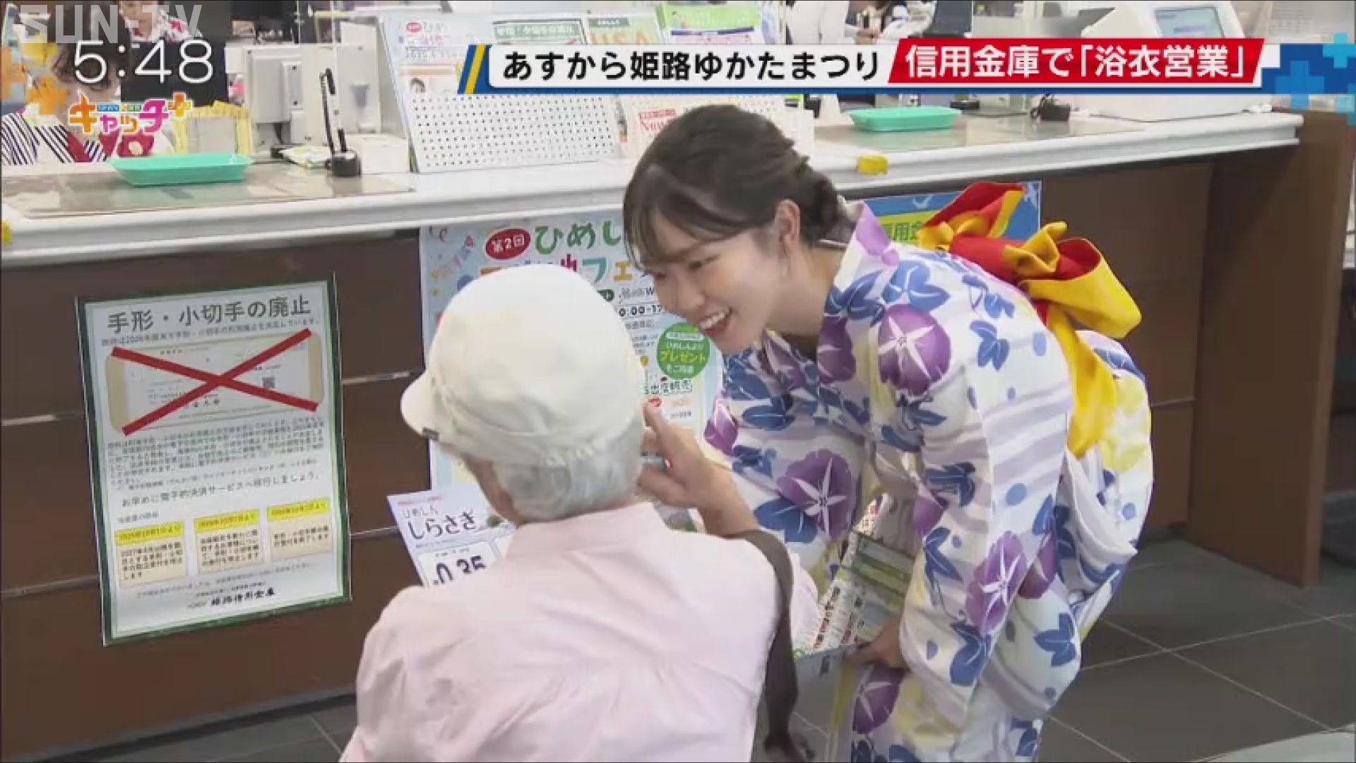 6月21日から始まる「姫路ゆかたまつり」に合わせて会場近くにある姫路市の信用金庫の支店では、職員が浴衣姿で業務にあたり、まつりムードを高めました。