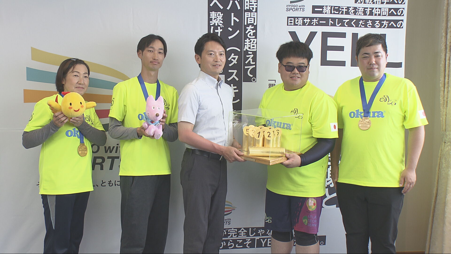 モルックの世界大会でアジア勢初となる優勝を果たした明石市のチームが兵庫県庁を訪れ、世界一の報告を行いました。