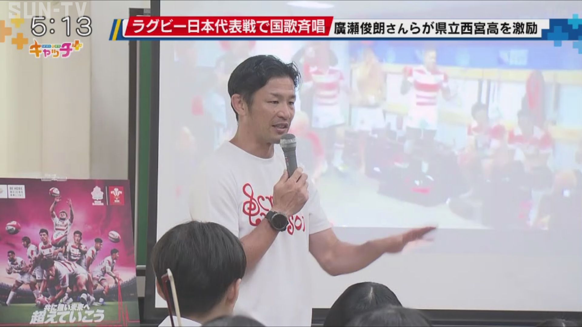 7月に神戸市内で開催されるラグビー日本代表戦で、国歌斉唱を行う県立西宮高校の生徒たちを、元ラグビー日本代表キャプテンの廣瀬俊朗さんらが激励しました。