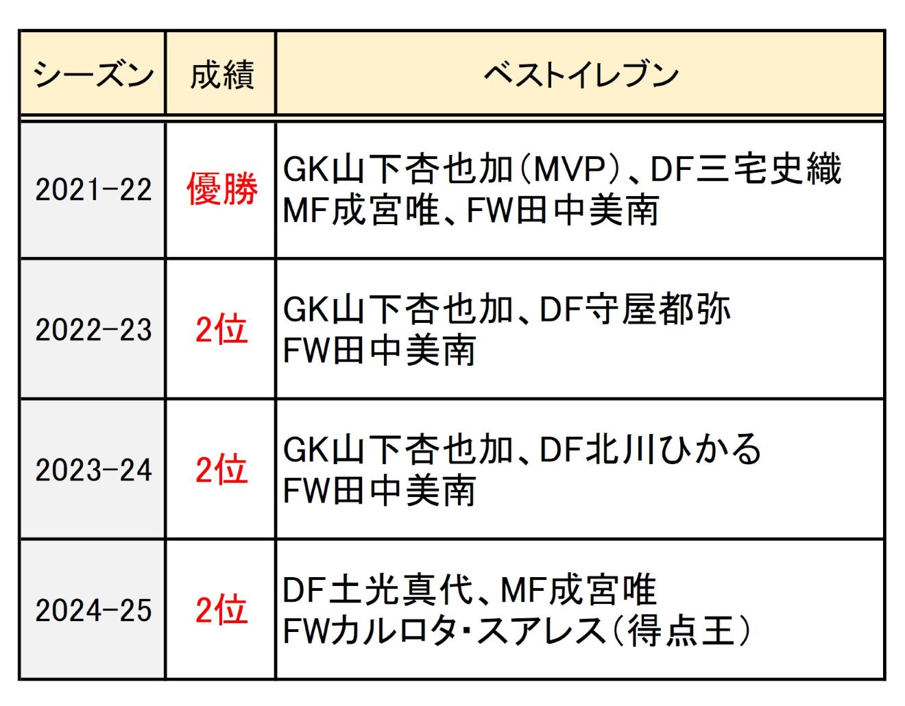 INAC神戸のシーズン別成績