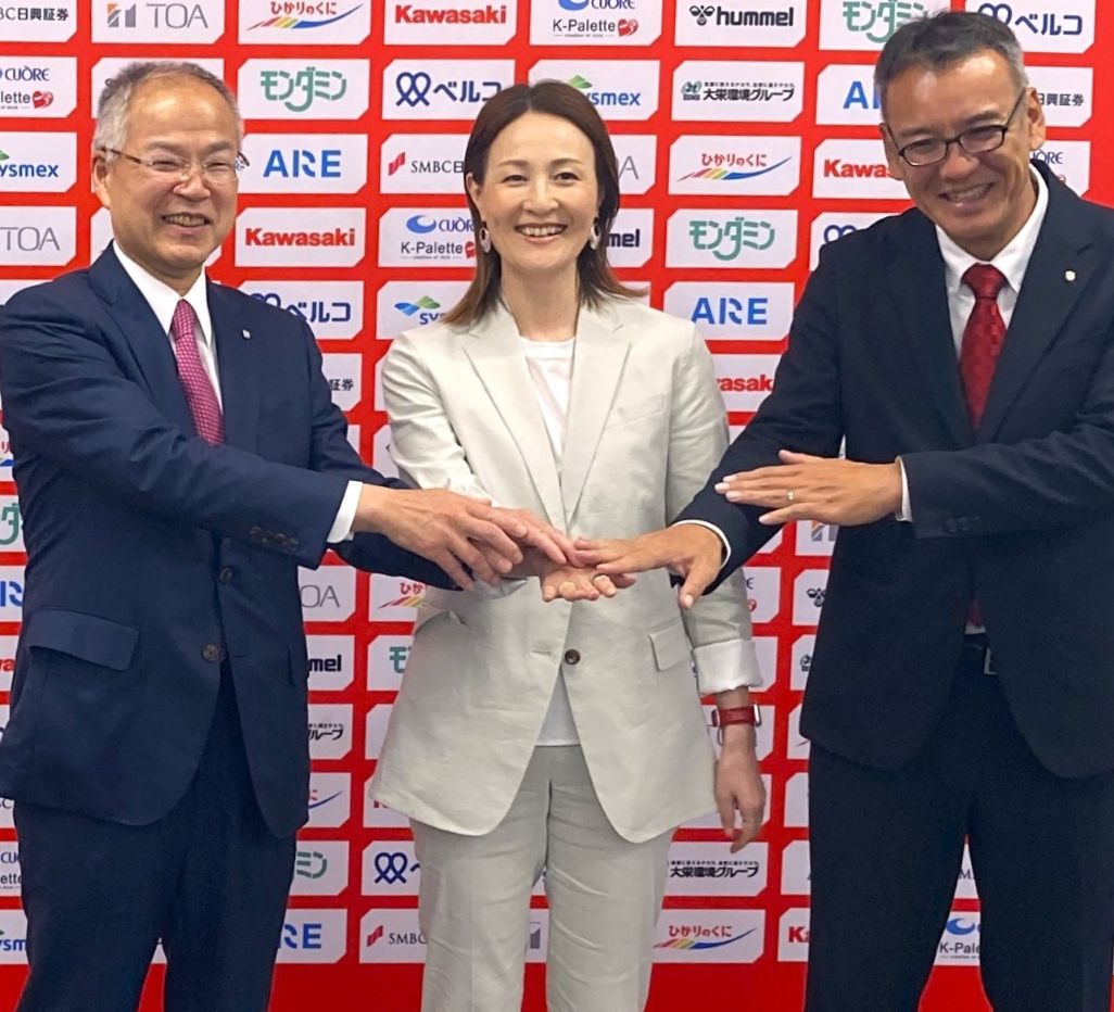 INAC神戸 宮本ともみ新監督(中央)、(左)アイナックフットボールクラブ・金子文雄会長兼社長、(右)髙嵜理貴チーム統括本部長 /6月10日