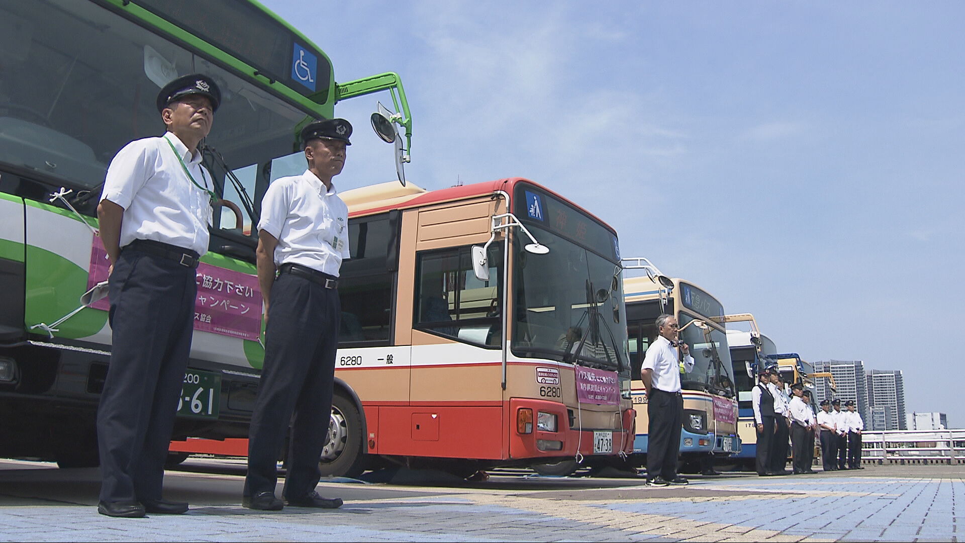 県内5つのバス会社のバスには、ドライバーに安全運転を呼び掛けるメッセージや、バス車内ではつり革をつかむよう呼び掛ける横断幕が掲げられ、白バイやパトカーの先導で市内を走り事故防止を呼び掛けました。