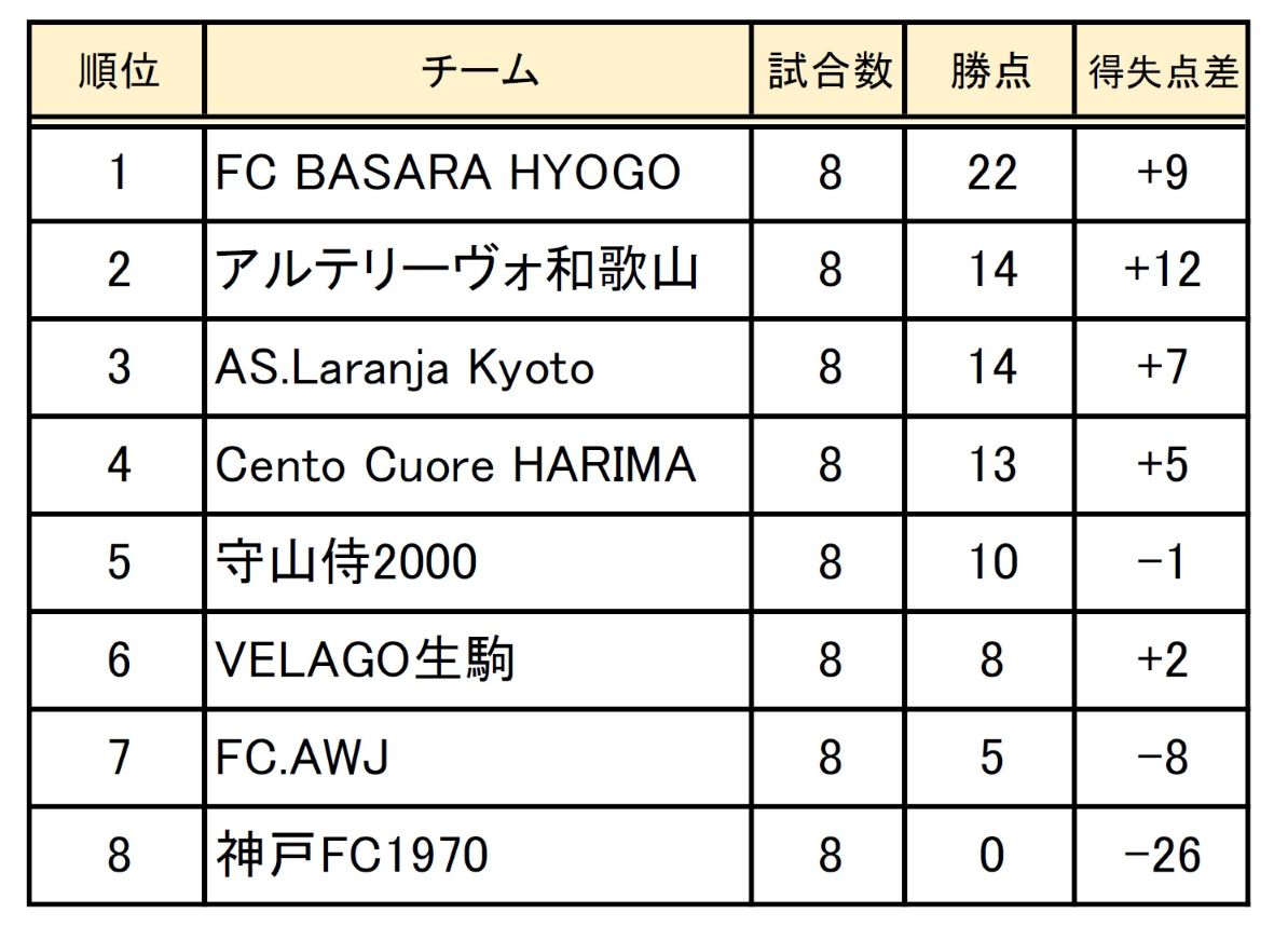 開幕2連勝のあと、第4節から4戦ドローが続いたが、前節、「FC.AWJ」(淡路島)を破って3勝目を挙げた。