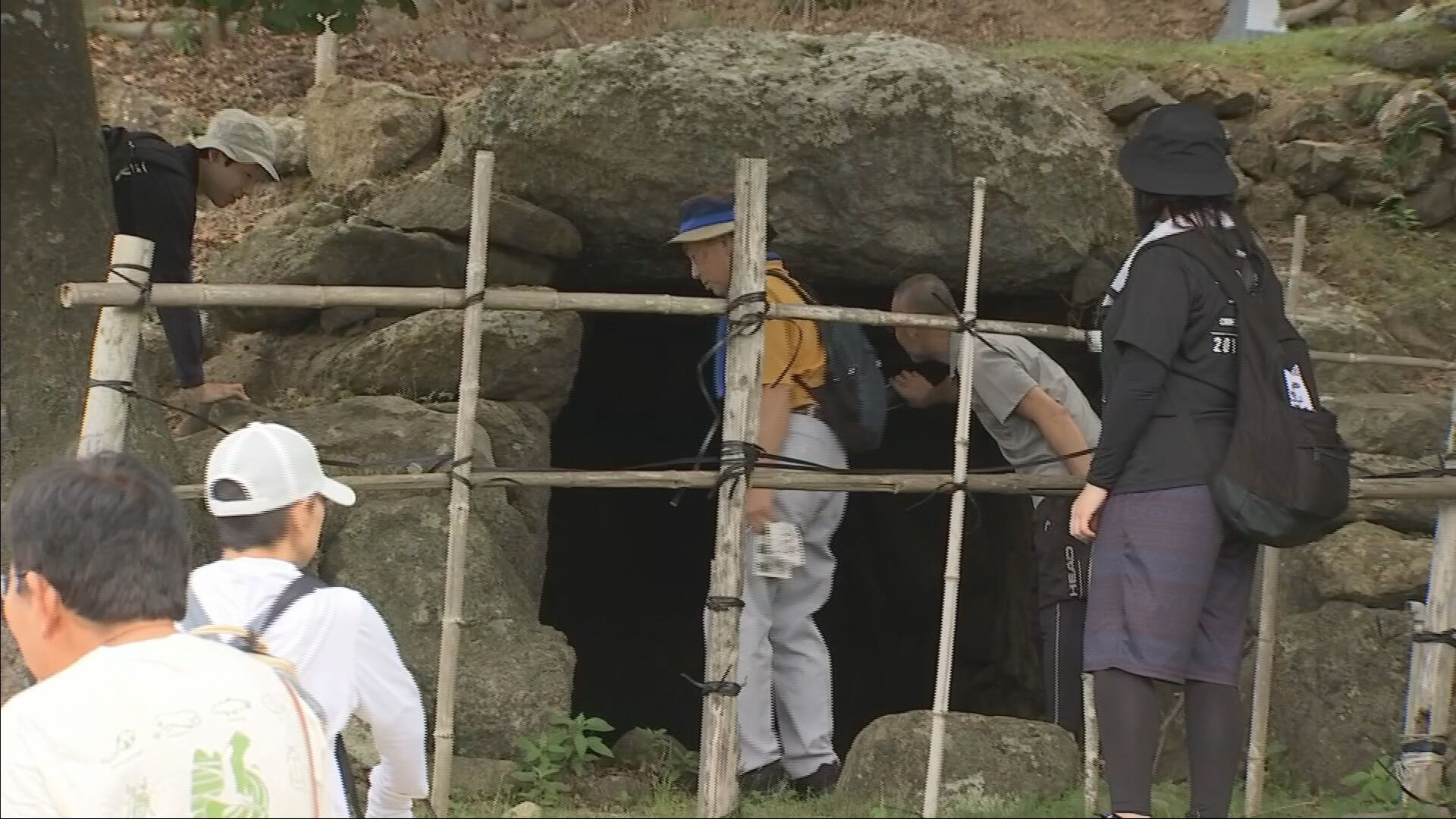 参加した10人は、地元の案内グループ「案ガールズ」から説明を受け、気比の銅鐸出土地や田結湿地などを巡りました。天気がくもりだったこともあり、約6キロの道のりを全員が歩き切りました。