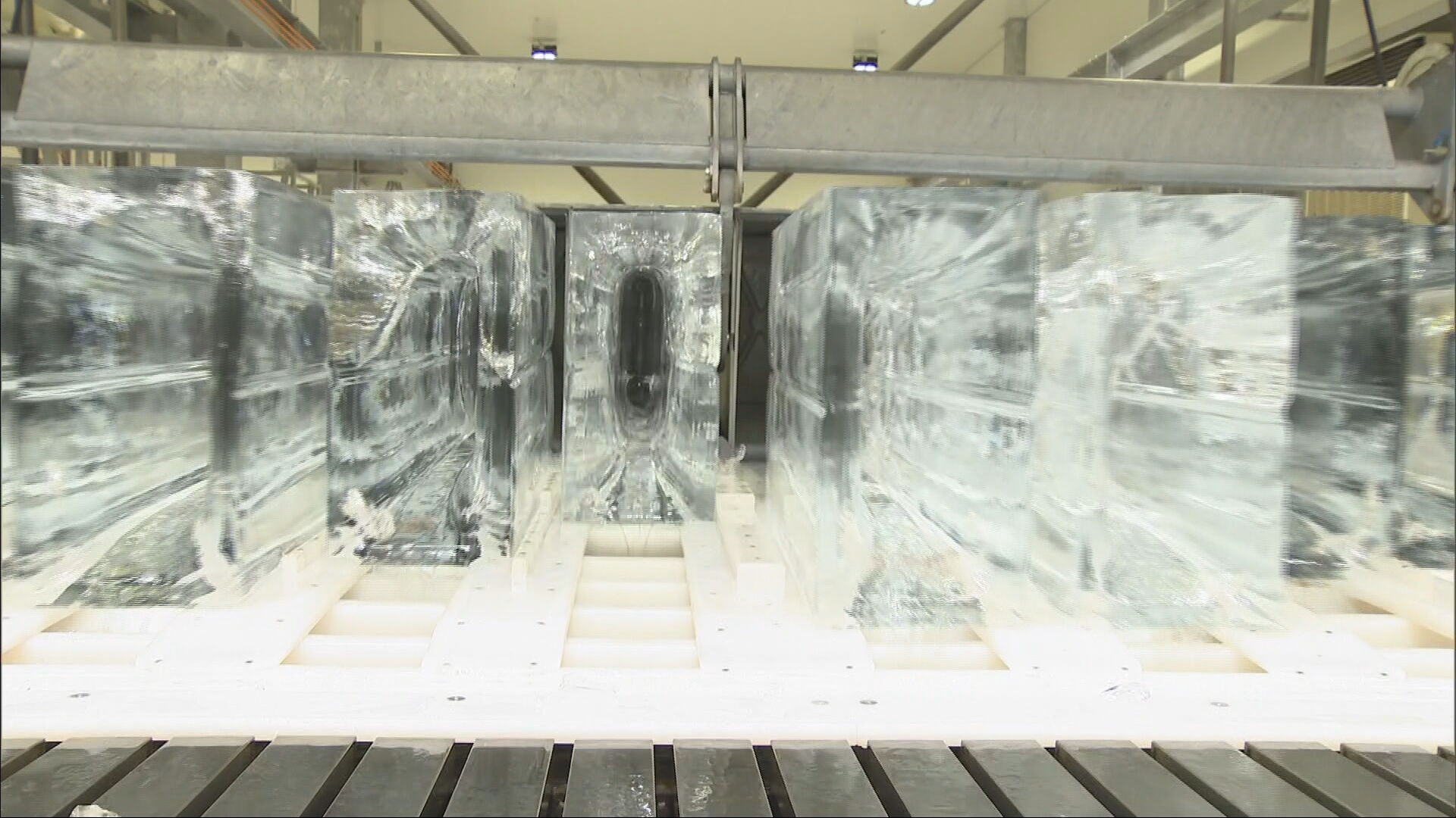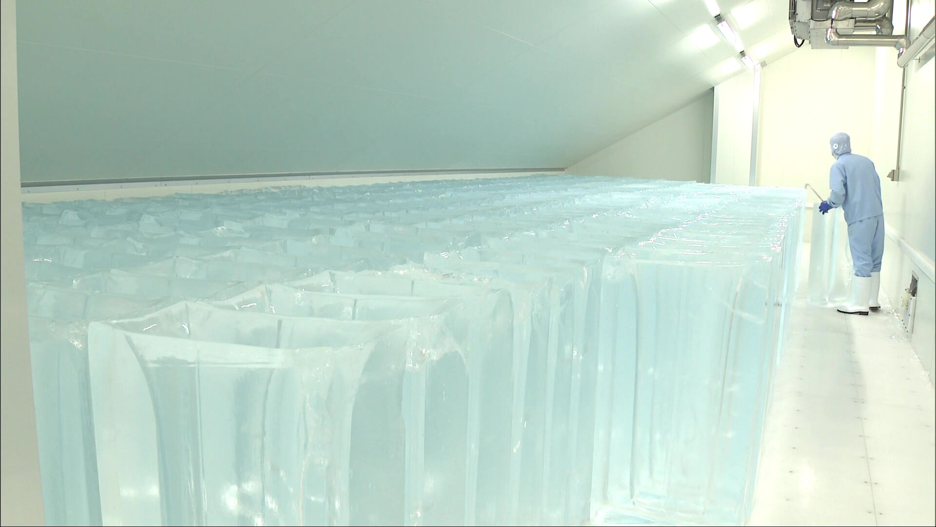 工場では、地下100メートルからくみ上げた天然水をじっくりと凍らせて透明度の高い氷を作り、砕いて出荷しています。