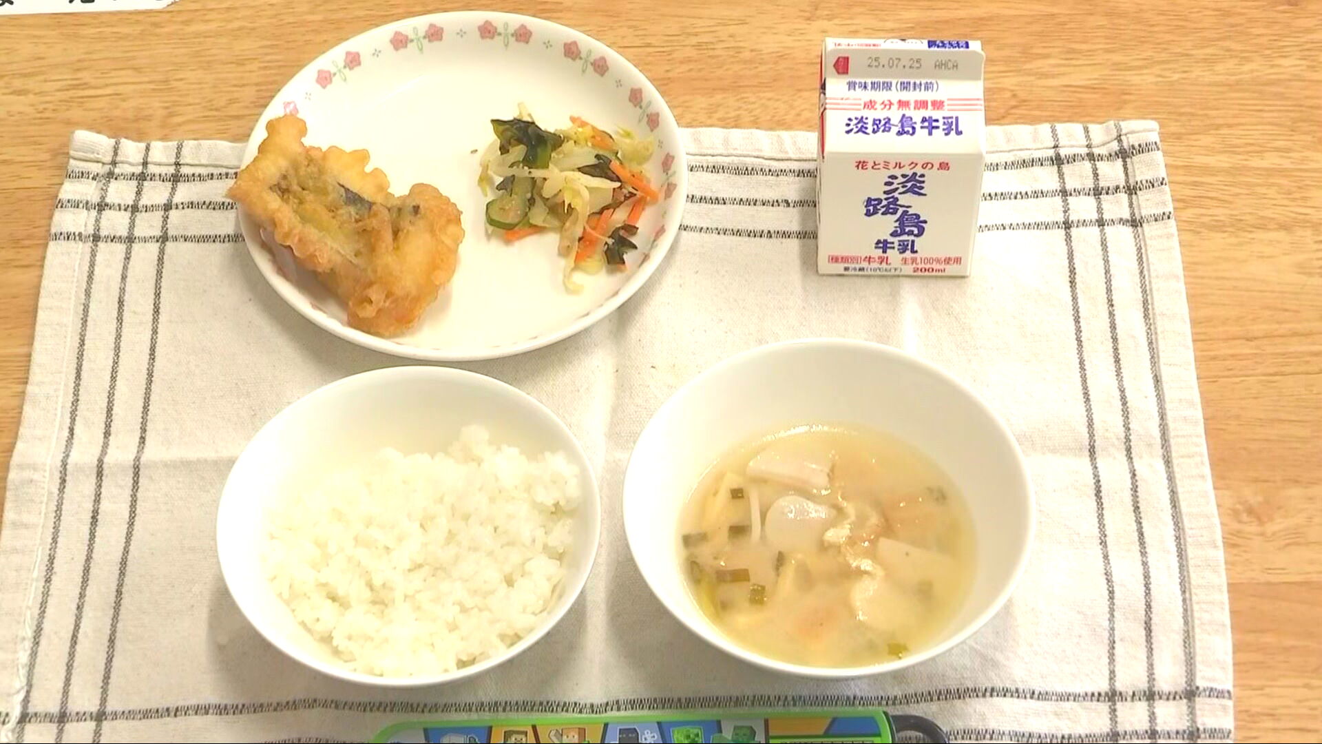この後の給食の時間には、ハモの天ぷらの他、和風サラダや淡路島牛乳など地元産の食材を使った料理が提供されました。