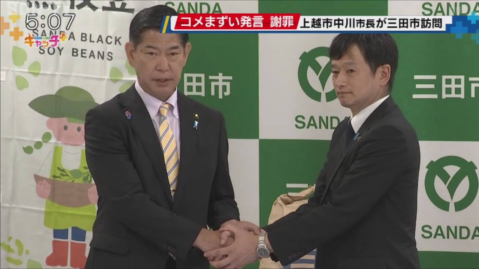 29日午前、三田市役所を訪れた新潟県上越市の中川幹太市長は三田市の田村克也市長に「関係者の方々に不快な思いをさせたことをおわび申し上げます」と頭を下げました。