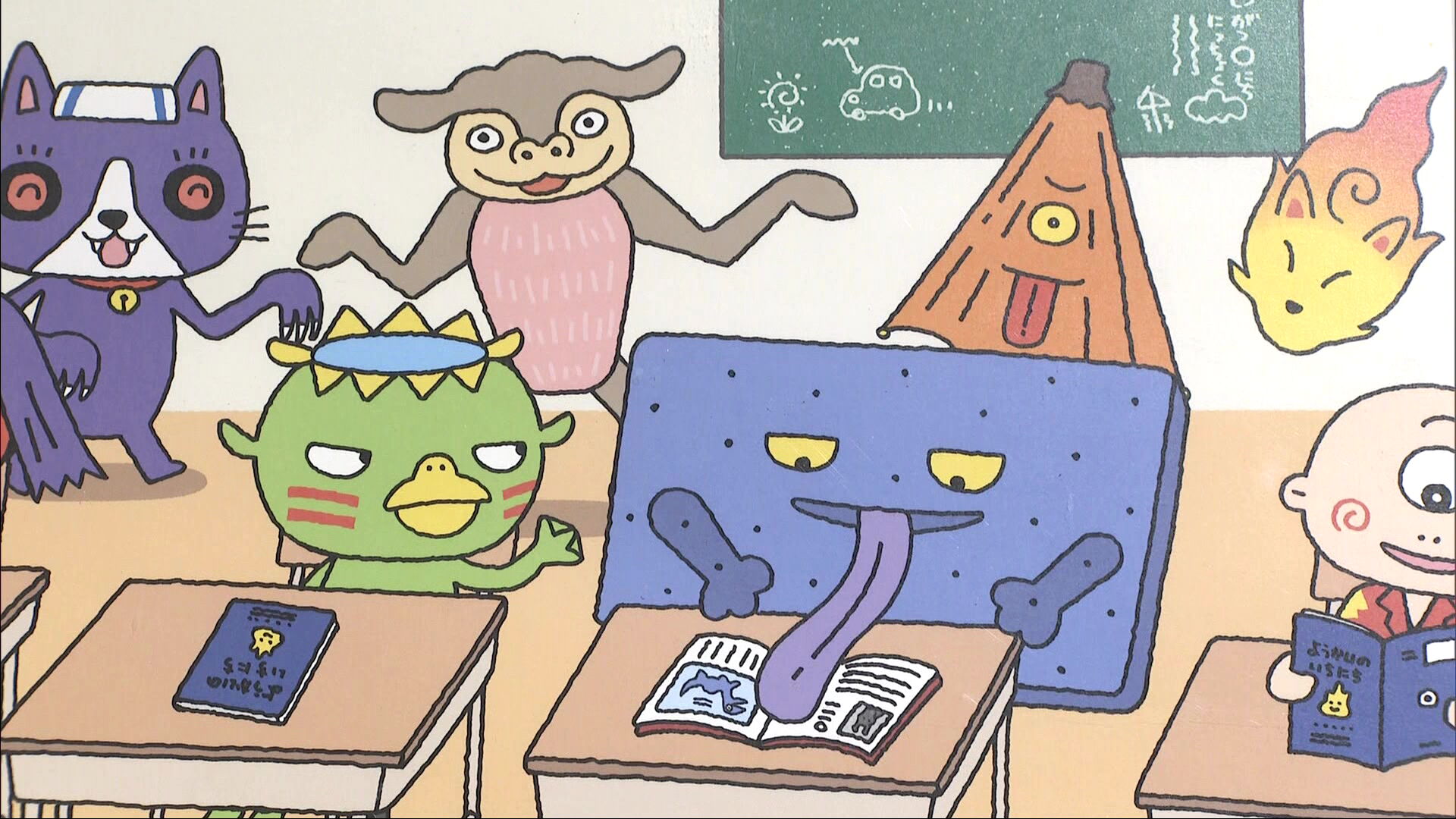 夏休みに何をするか、教室で相談する妖怪たち。みんなで海に出かけたようです。