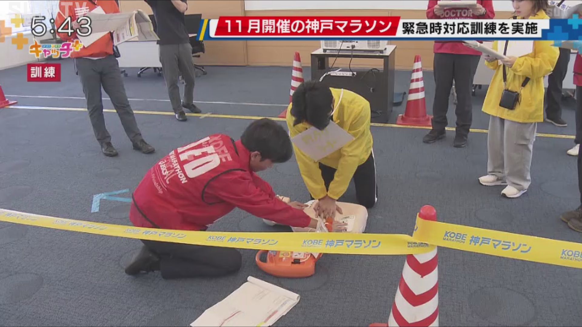 11月16日に開催される神戸マラソンを前に、急病人の発生や不審物の発見など突然のアクシデントに対応するための訓練が兵庫県神戸市の神戸学院大学ポートアイランドキャンパスで行われました。