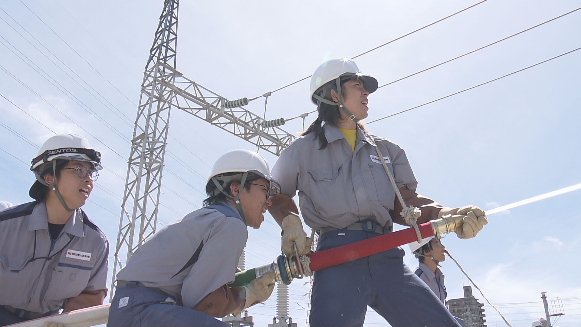 訓練は、電線の外に電気が流れないようにする機能を持つ碍子(がいし)と呼ばれる電力設備の洗浄作業が行われ若手社員らが、熟練の社員から高圧放水を使った効率的な洗浄方法などを継承していました。