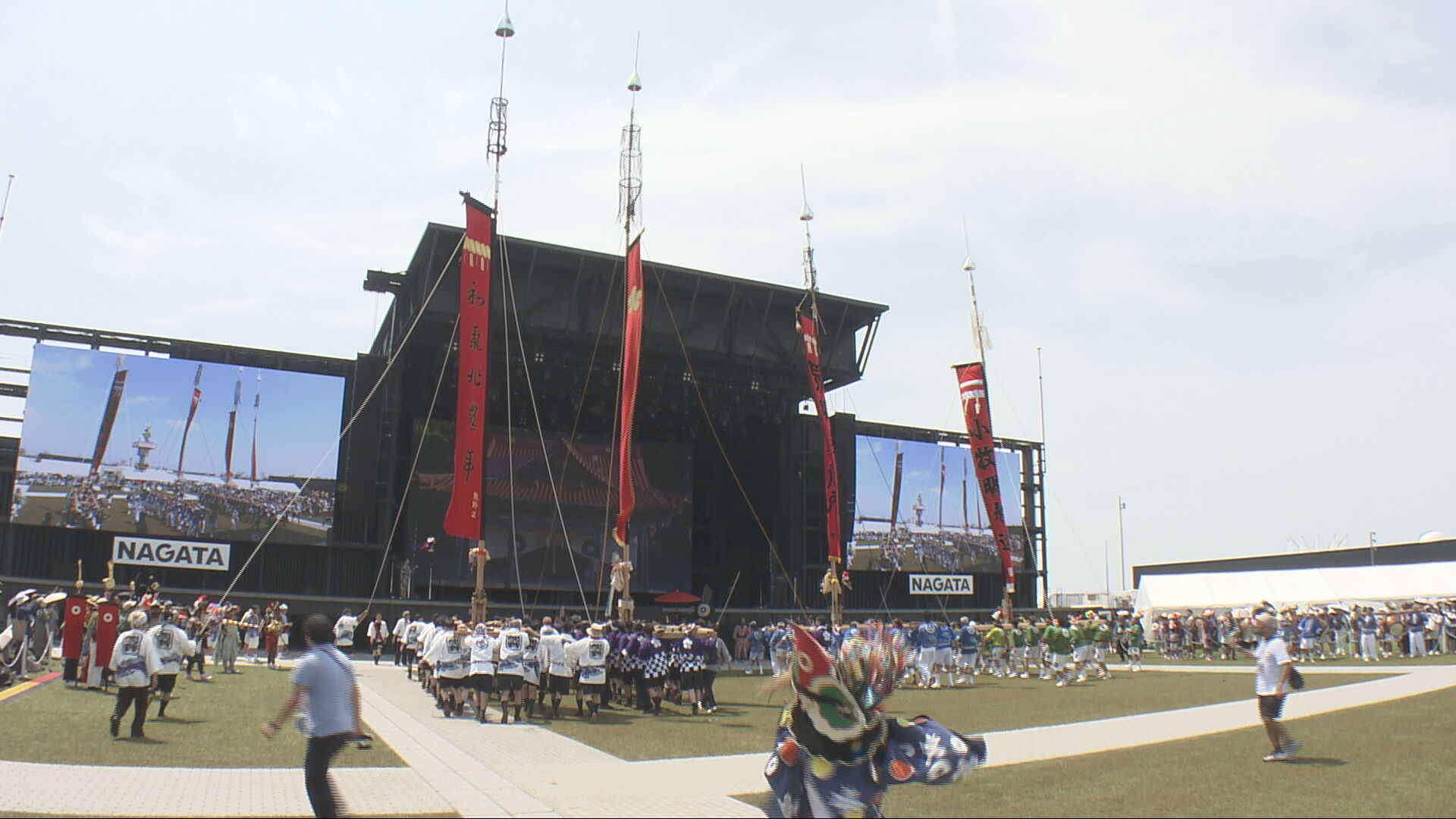 2024年発生した能登半島地震の被災地からは七尾市中島町に伝わる奇祭「お熊甲祭」が披露され、総勢約200人が、勇壮な掛け声とともに、高さ約20メートルの枠旗と呼ばれる深紅の大旗を担いで登場しました。