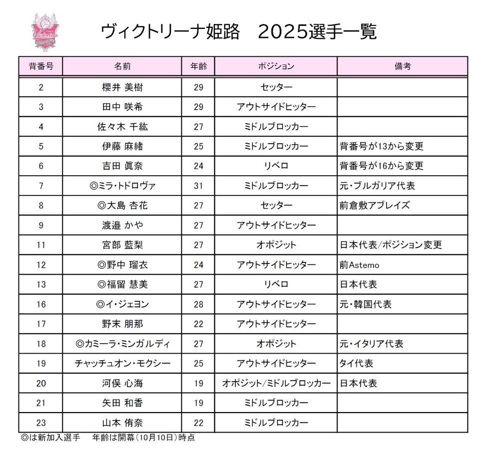 新たに、日本代表の福留慧美(リベロ)・野中瑠衣(アウトサイドヒッター)、セッターの大島杏花、元・韓国代表のイ・ジェヨン、元・イタリア代表のカミーラ・ミンガルディに、ミラ・トドロヴァを加えた6選手が加入した。
