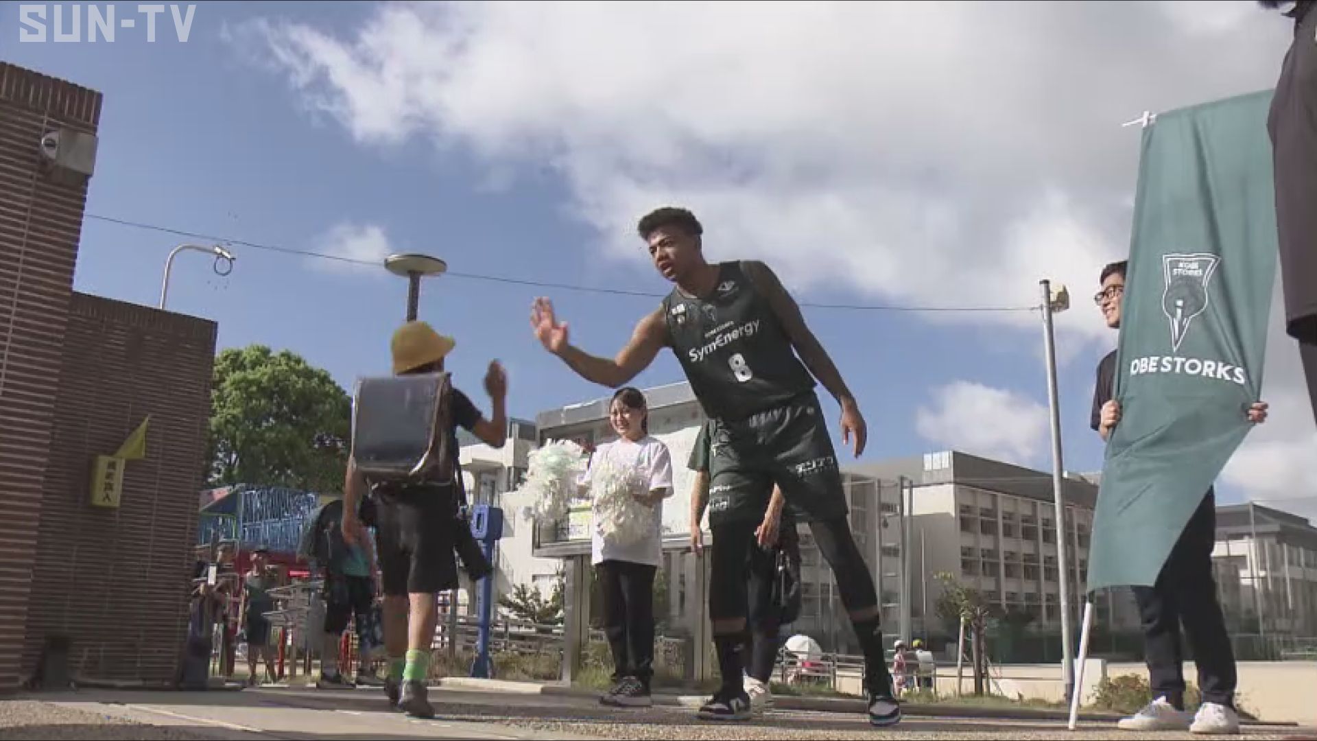 プロバスケットボールチーム「神戸ストークス」の選手らが9月1日から新学期を迎えた児童たちに元気な朝の挨拶でエールを送りました。