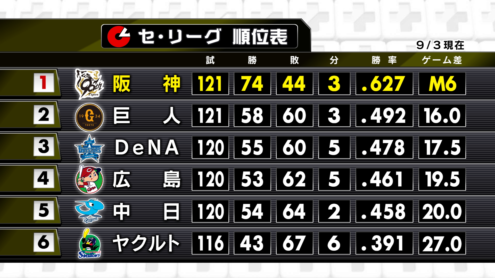 9月3日現在、阪神タイガースは74勝44敗3分けで貯金30。2位巨人とのゲーム差は16とセリーグ首位独走中で、優勝マジックを6まで減らしています。2位以下の5球団すべてが借金を抱えている異常な状態が続いています。