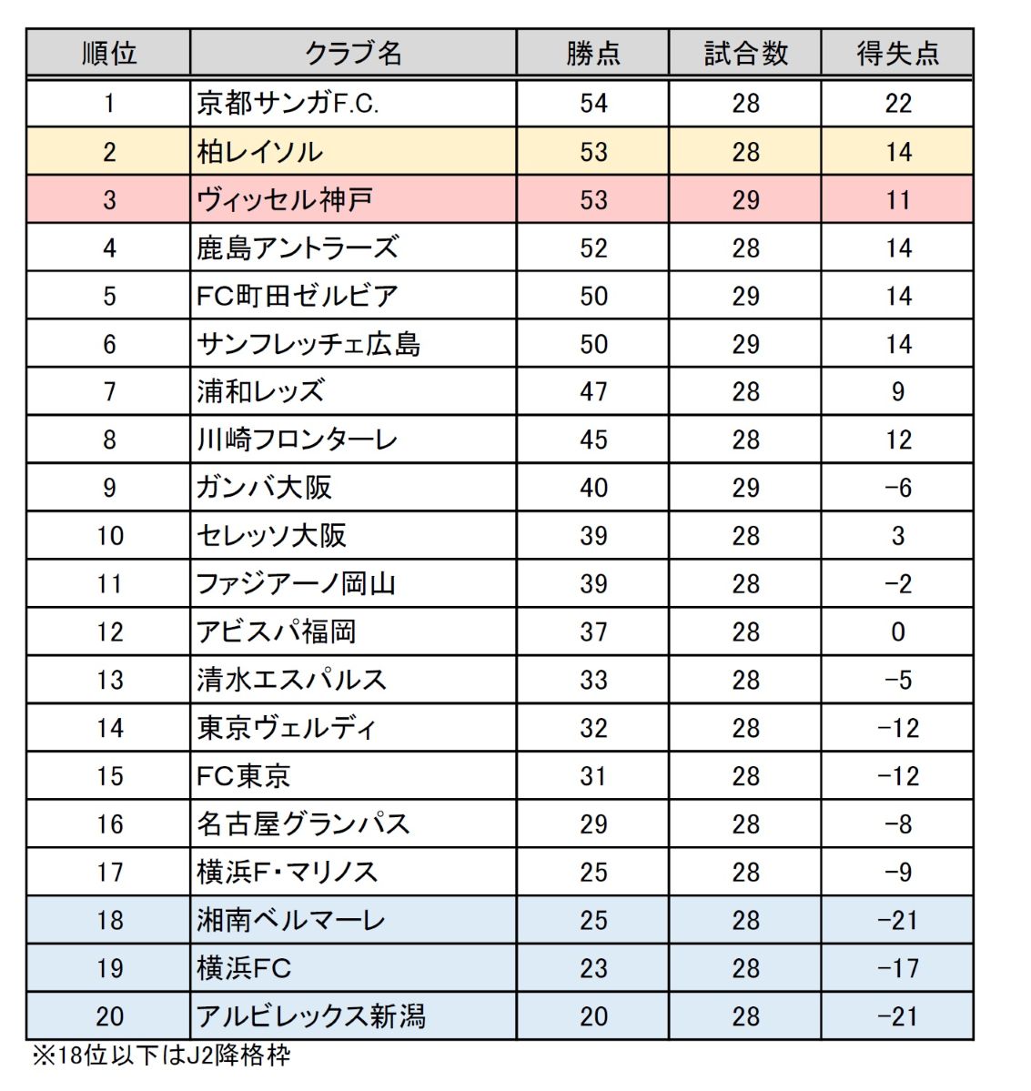 ともに勝点「53」で並ぶが、消化試合数はヴィッセルが1試合多い。