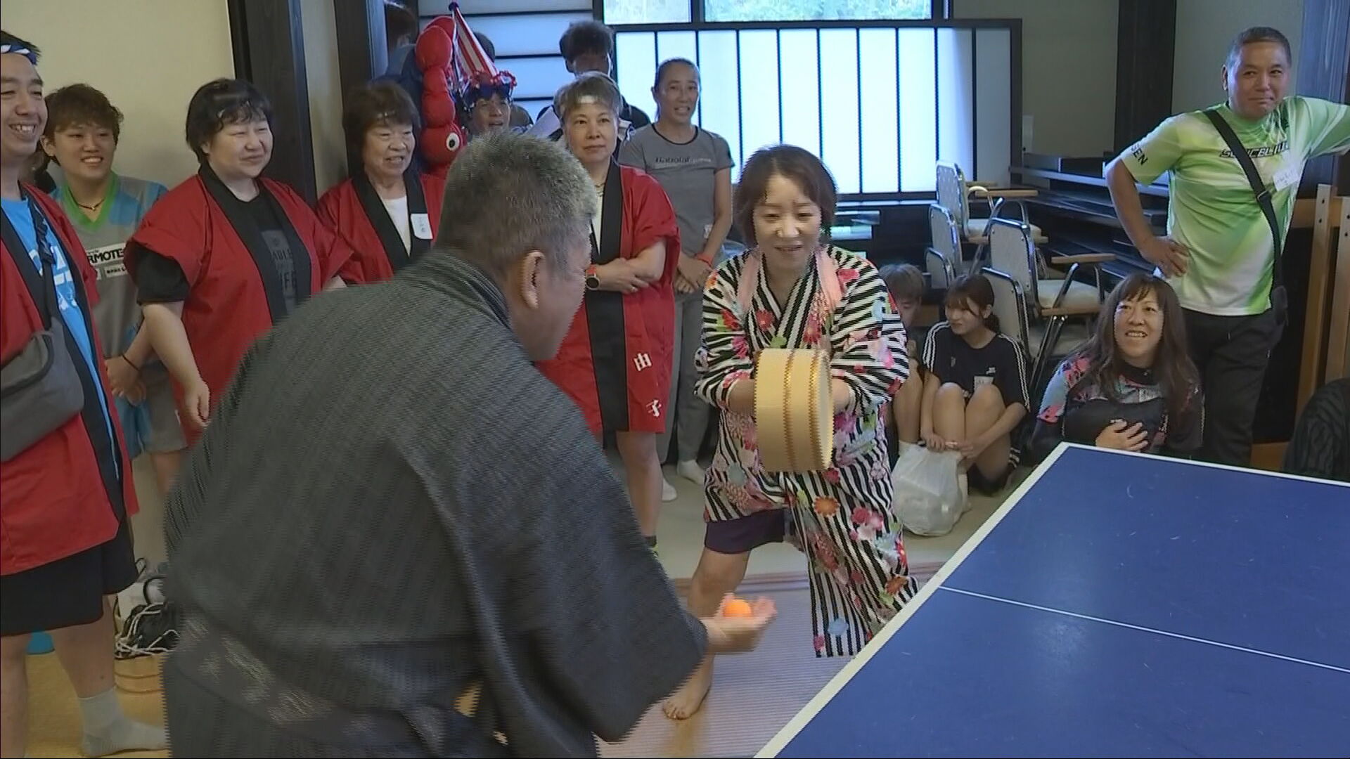 ラケットではなく風呂桶で玉を打ち合う「桶ット卓球選手権」。靴は履かず、畳の上で行います。