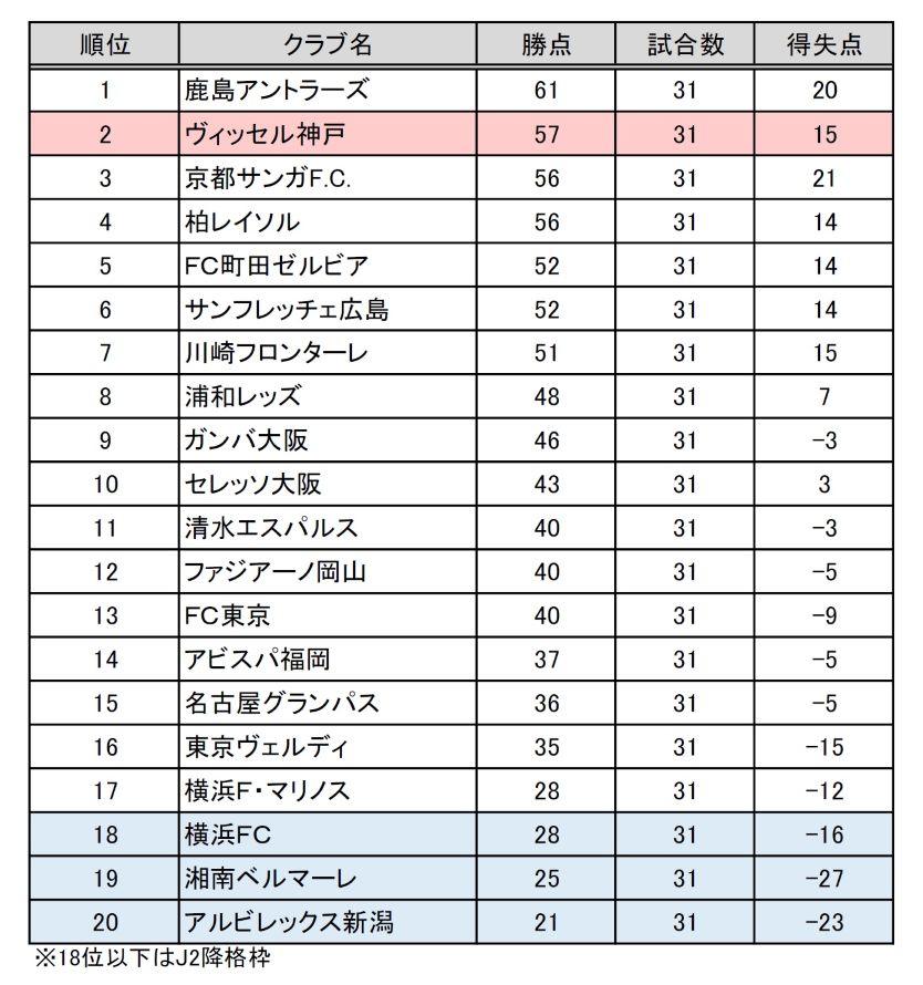 J1リーグ戦は全チームが31試合を消化し、鹿島アントラーズが首位。
