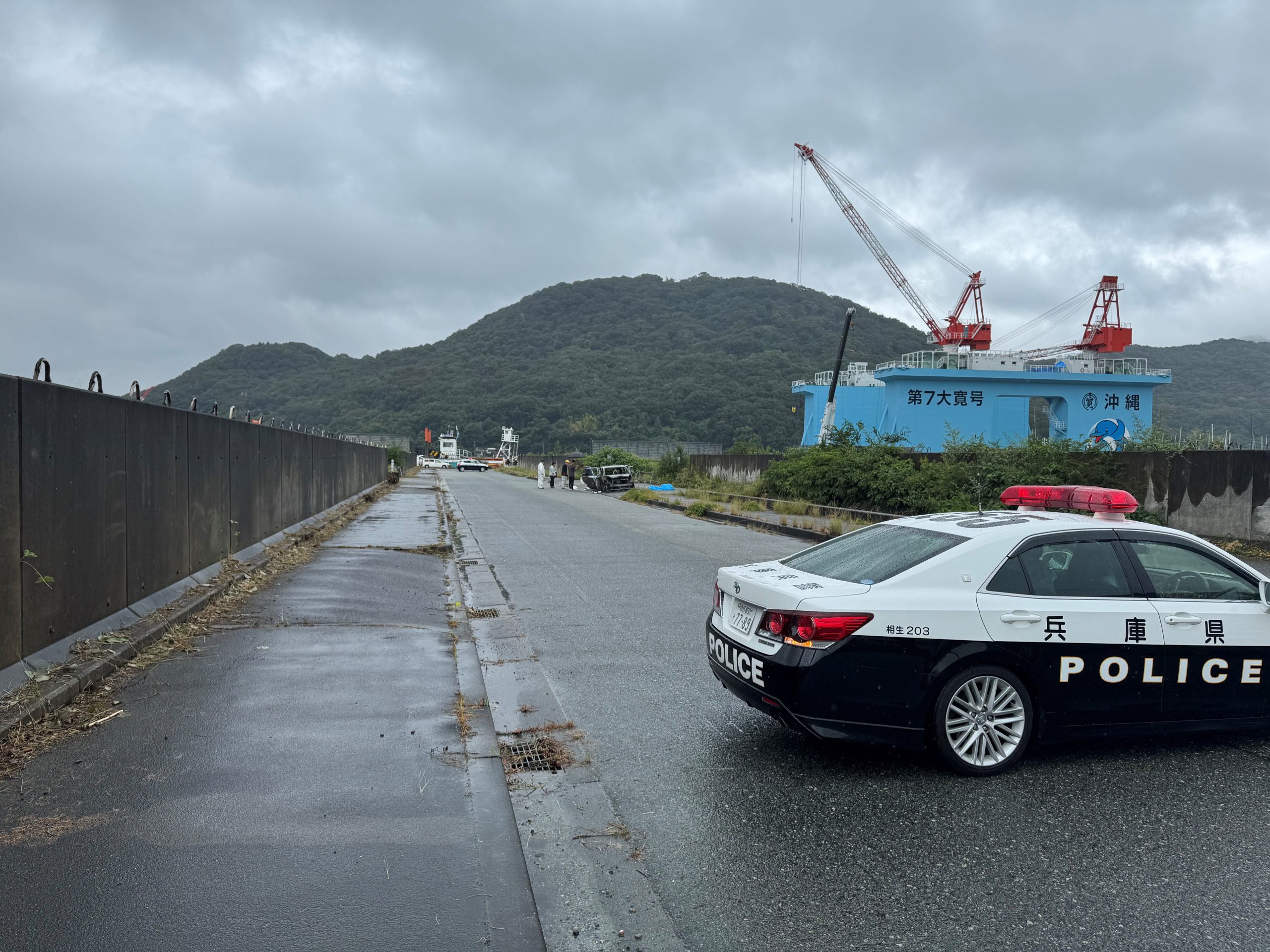4日午前4時30分ごろ、相生市相生の野瀬埠頭付近の歩道で、「クラクションが鳴り爆発音がして炎が上がり、何かが燃えている」と近くの工場に勤務する男性から消防に通報がありました。