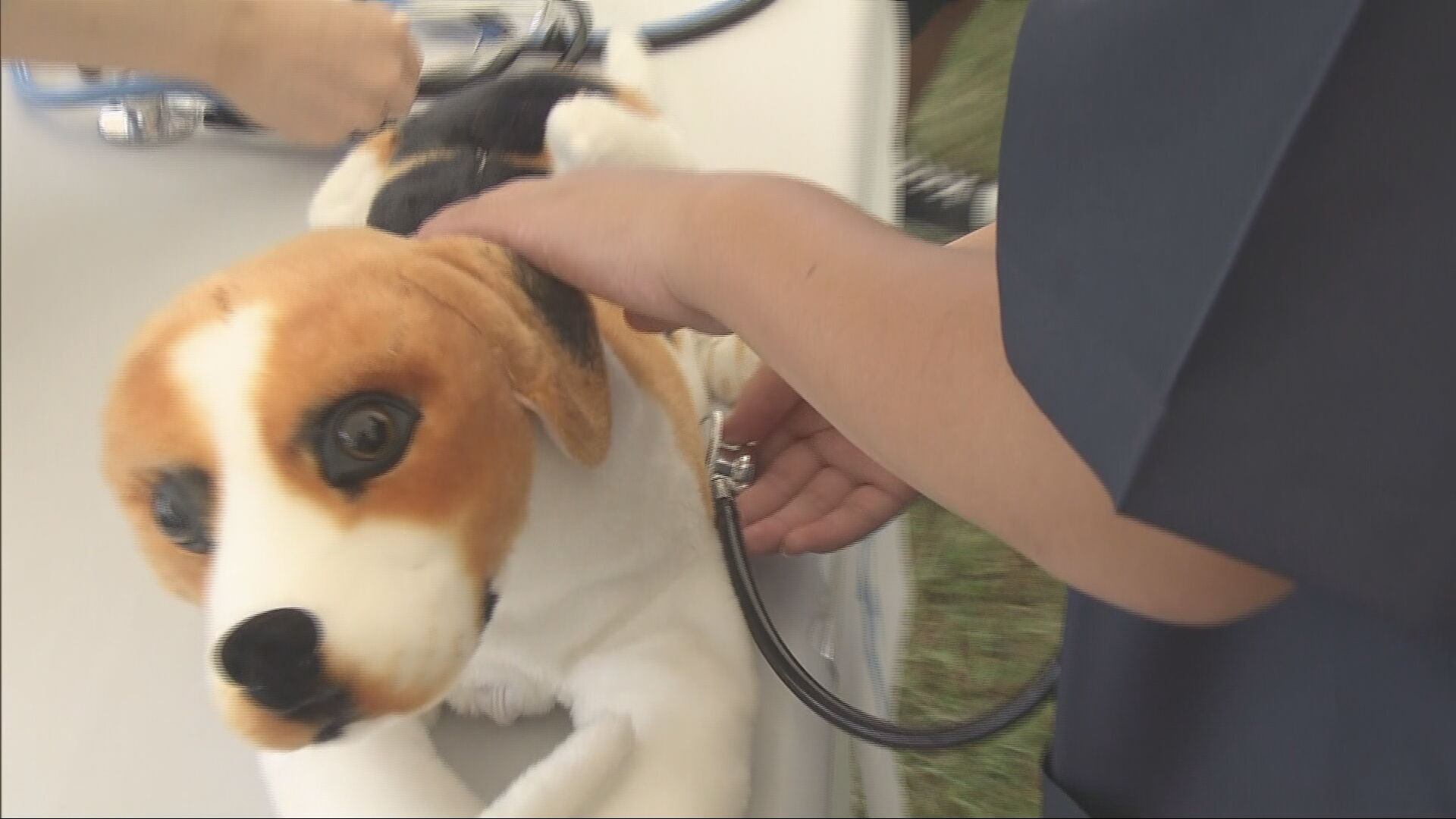 会場には、獣医師の仕事を体験できるブースが設けられ白衣を着た子どもたちは、犬のぬいぐるみを使って診療やケアの体験をした他、聴診器の使い方について医師からアドバイスを受けました。