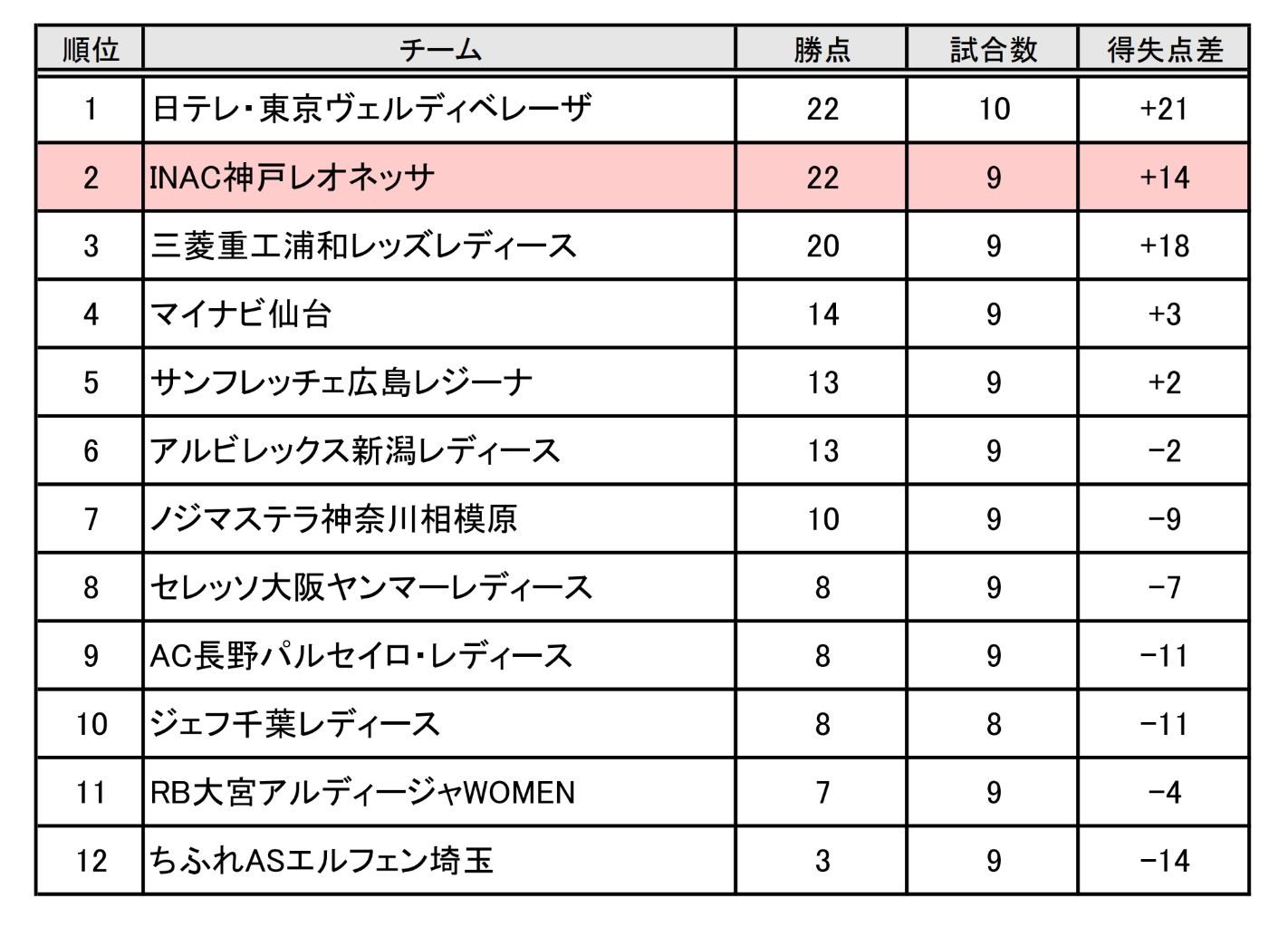 勝点を「22」に伸ばし、1試合多く消化している首位の日テレ・東京ヴェルディベレーザに並んだ。