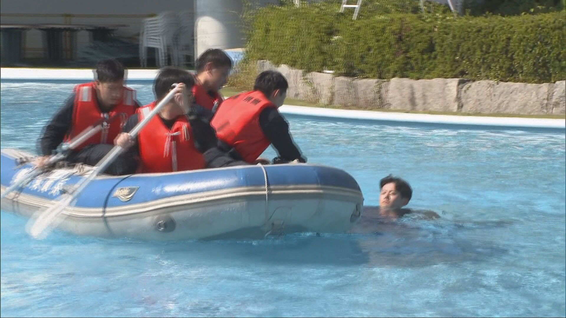 署員らはまず、水中の障害物に足をぶつけないよう、水面に足を上げて泳ぐ方法や救助用のボートのかじ取りや方向転換のコツなどを指導員から教わりました。