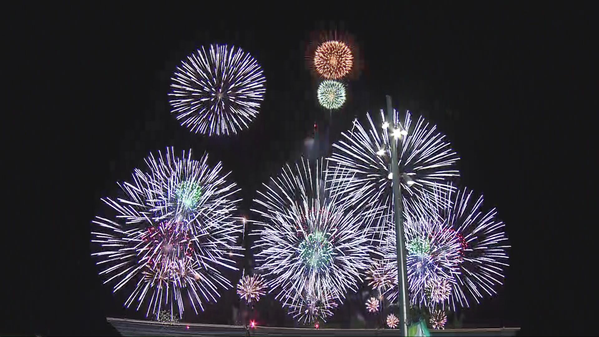 日が暮れた午後6時半過ぎ、上空に次々と打ち上げられた花火。
