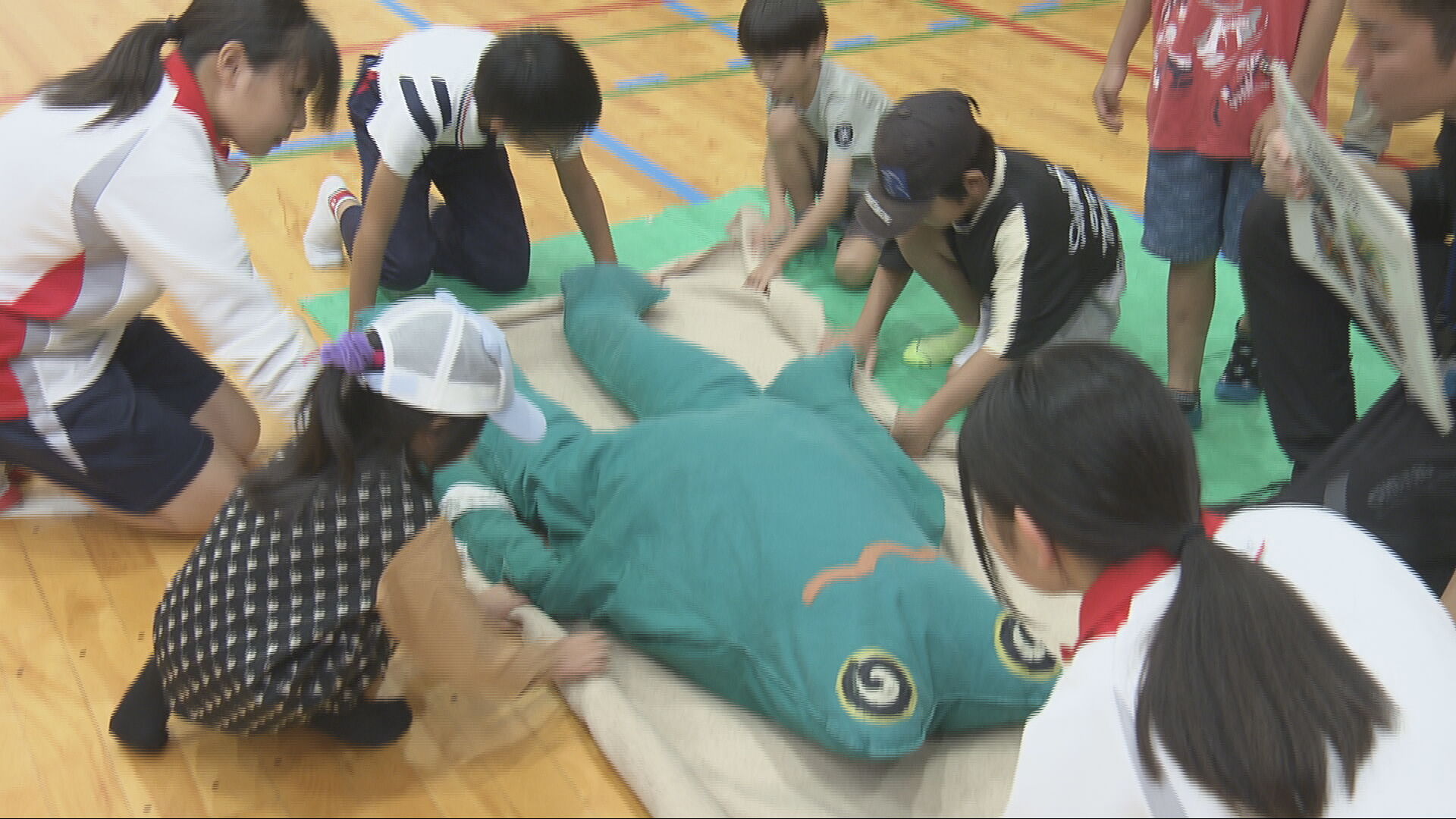 この他、「スポーツと防災」をテーマにした体験コーナーも設けられ、身近にある毛布を担架にして急病人を運ぶリレーなどを通じて、運動しながら命を守る大切さを学んでいました。