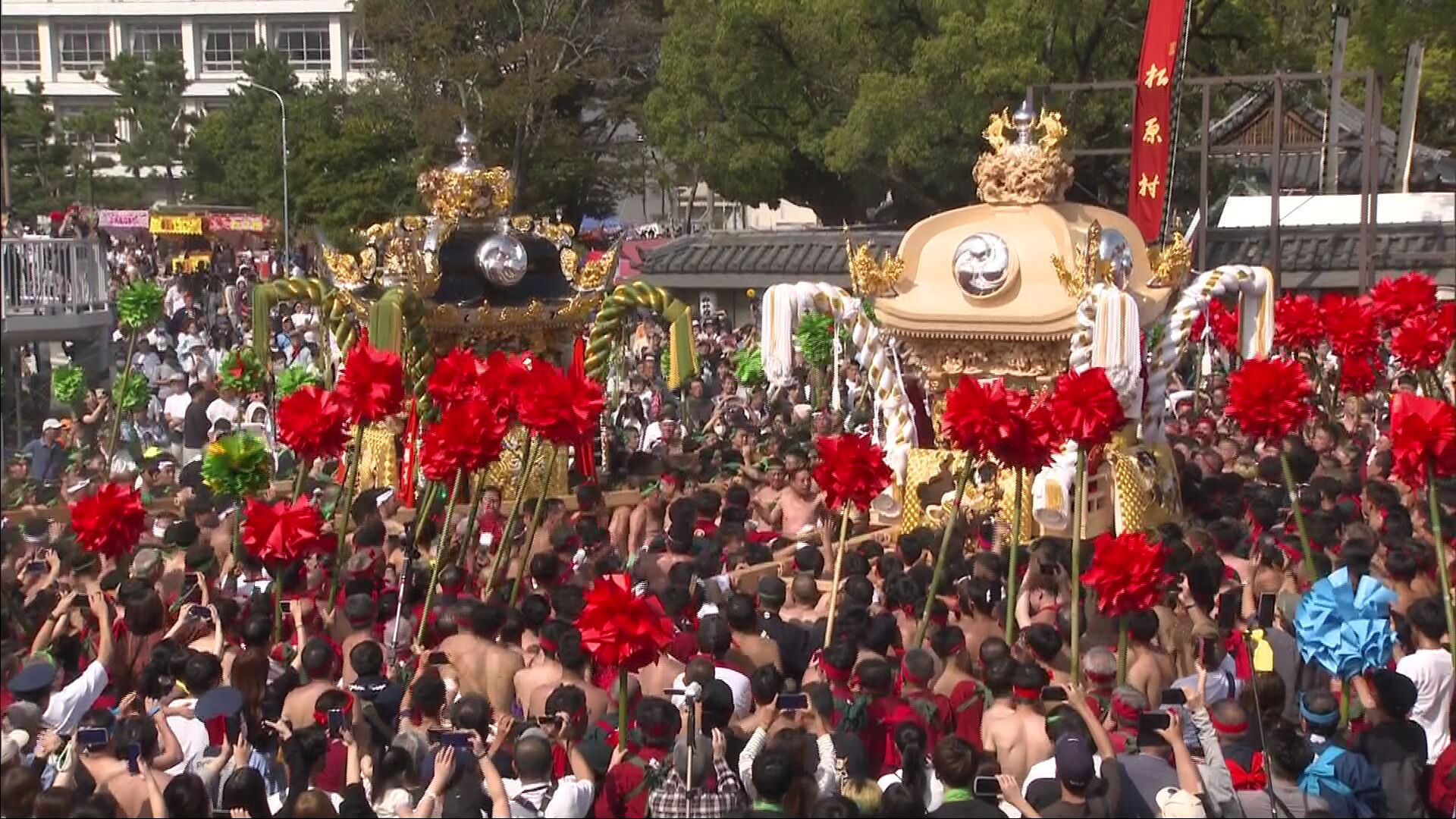 宵宮では、金銀の金具や刺繍で装飾された屋台が各地区を巡行した後、旧灘7カ村の氏子らが次々と楼門前に到着し、屋台練りを披露。