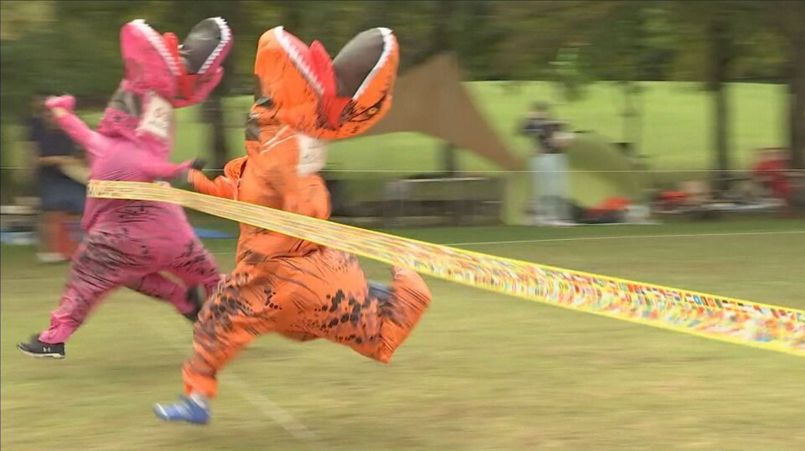 その名もティラノサウルスレース。恐竜の着ぐるみを着て走ります。