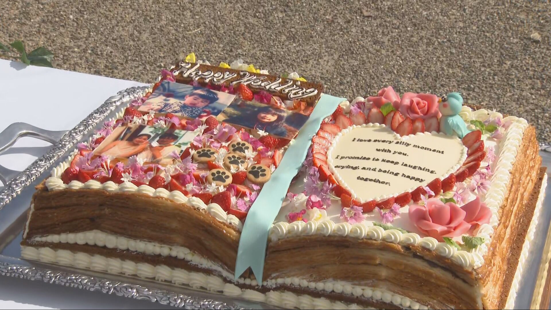 ウエディングケーキは、チョコレートでつくられた2人の写真が飾られアルバムの1ページのように仕上げられています。デザインは、稲美町制施行70周年を記念して公募で選ばれました。