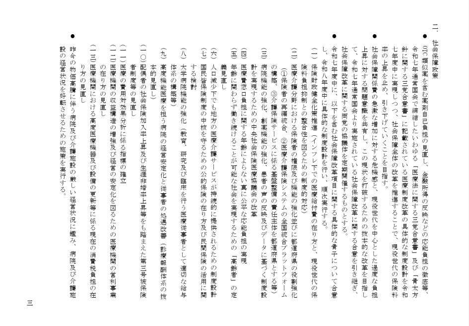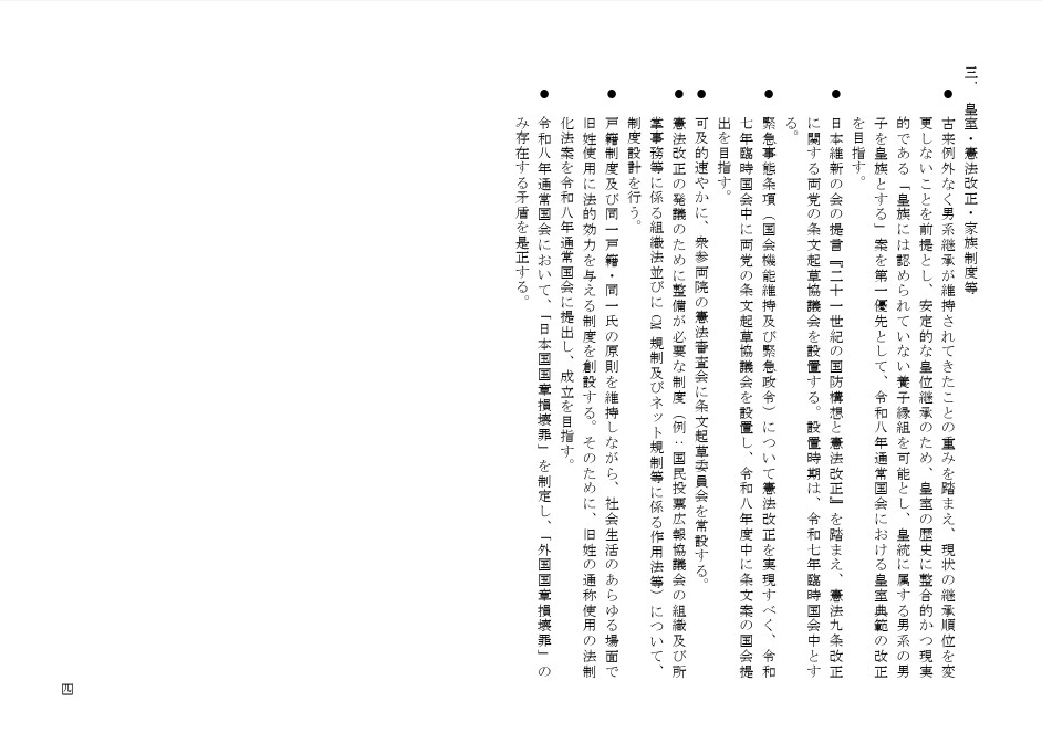 副首都構想の法案成立や、憲法改正への協議会を設置し来年度中に条文案の国会提出を目指すことなどが盛り込まれています。