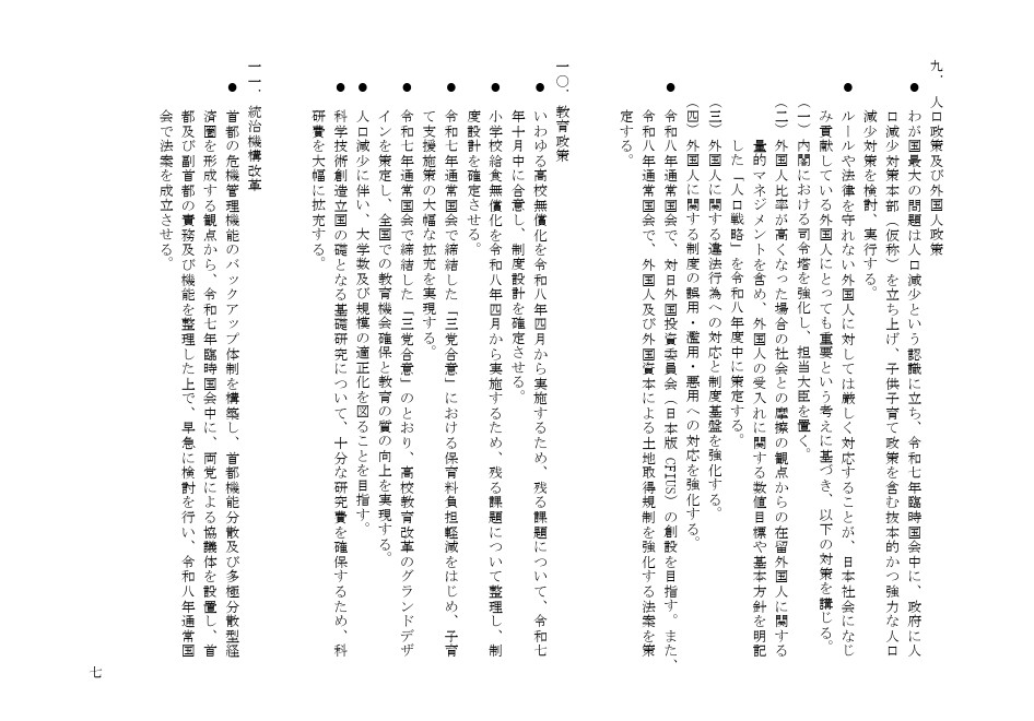 人口政策及び外国人政策・教育政策・統治機構改革について