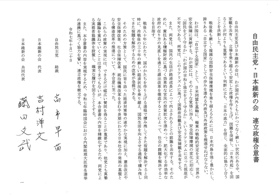 自民党の高市早苗総裁と日本維新の会の吉村洋文代表は、10月20日夕方、連立政権樹立の合意文書に署名しました。