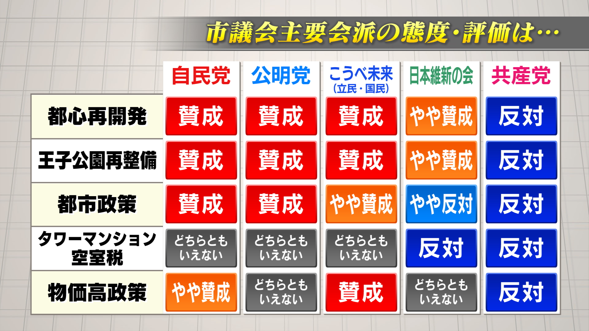 神戸市長選の争点となっているテーマについて、各候補者の考えを整理したうえで神戸市政を両輪で動かす議決機関でもある神戸市議会の各会派にもこの争点についての考えと態度を伺いました。