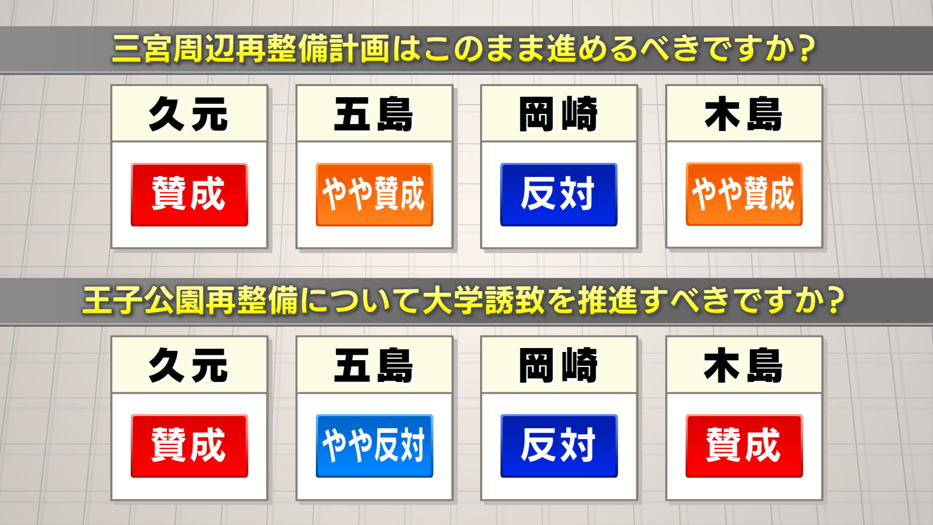 ①三宮再整備 ②王子公園再整備 各候補の考え