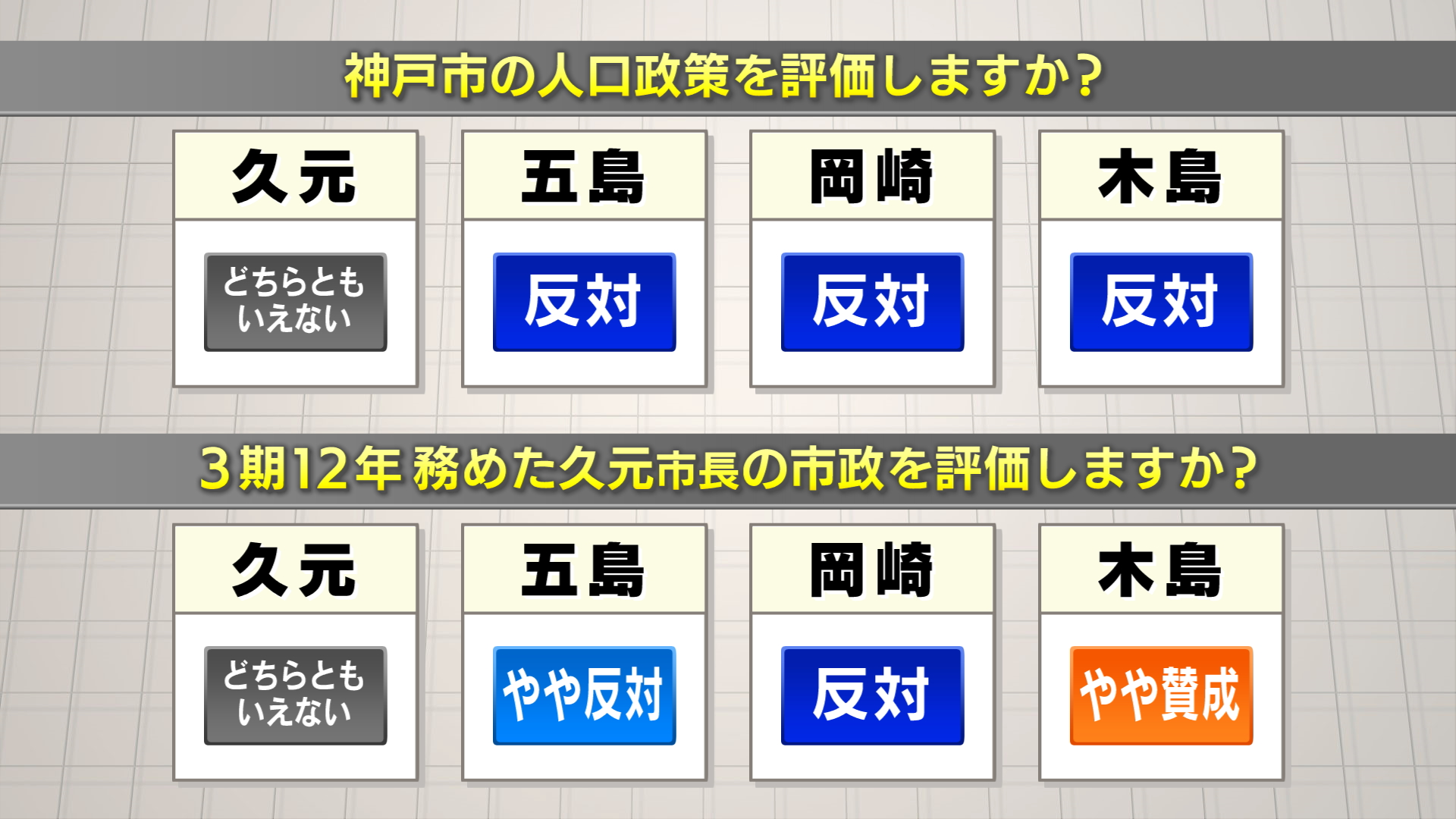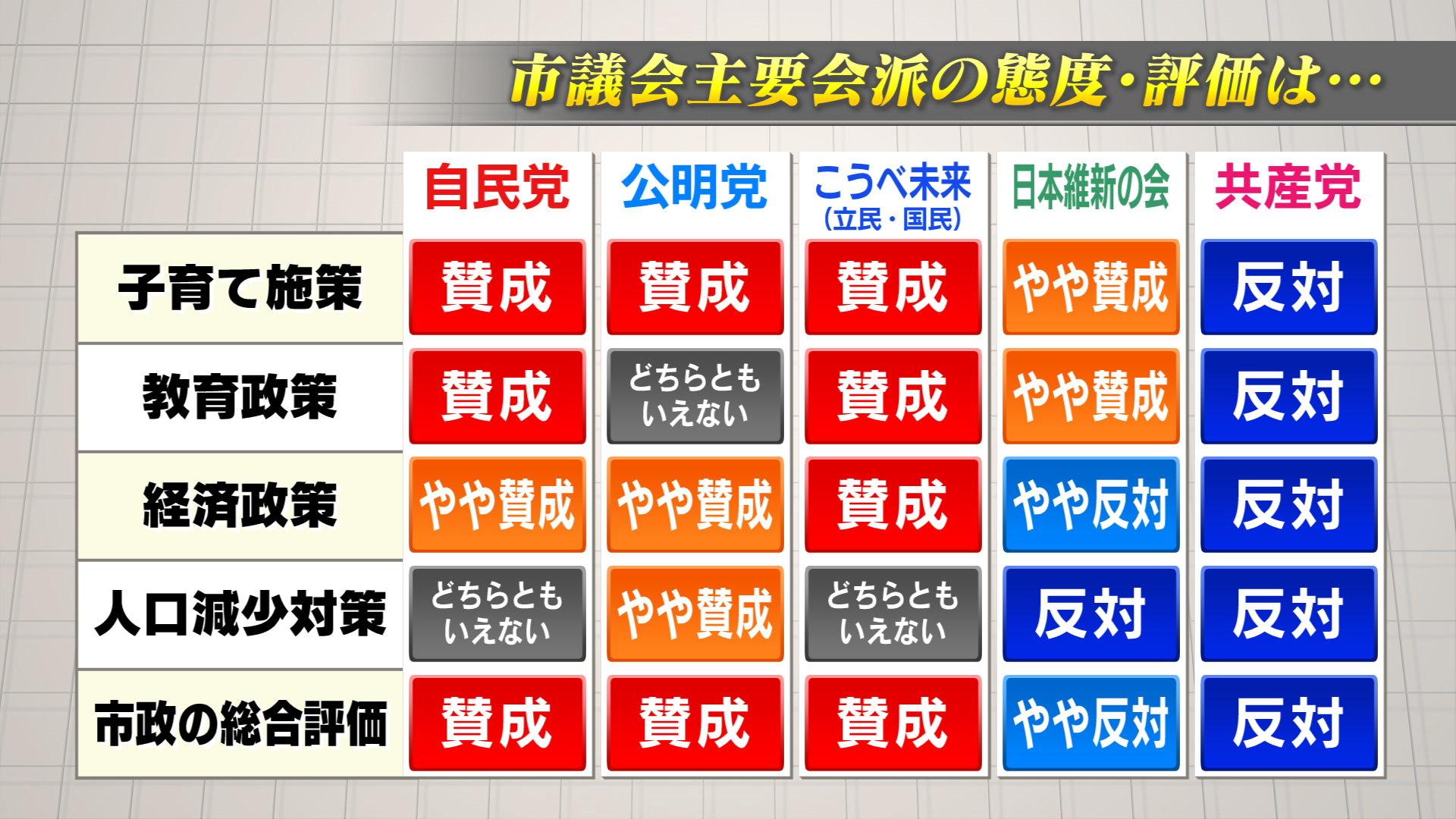 「自民党」「公明党」「こうべ未来」の3会派は、一部政策を除き、久元さんを支持する回答が目立ちます。